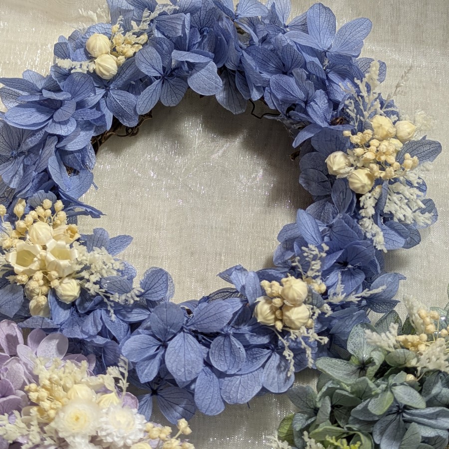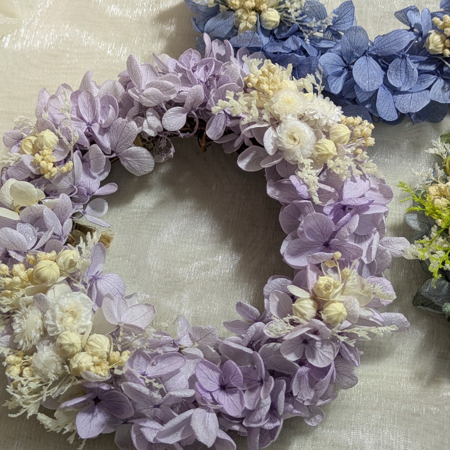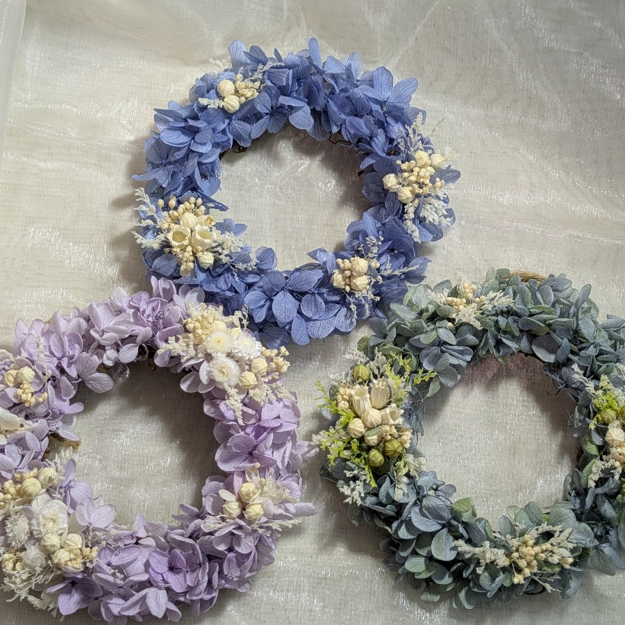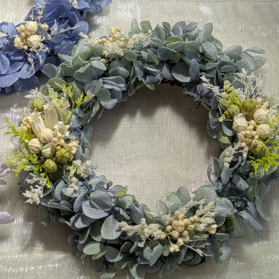 寒色系のニュアンスカラーの紫陽花を使って、ちっちゃなリースをつくりました。