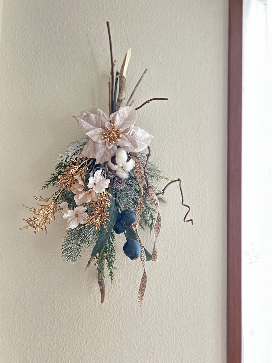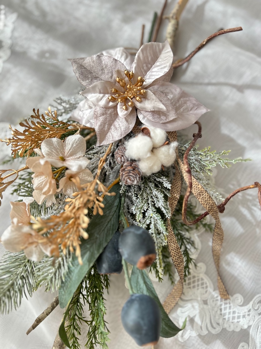 天然木やコットンポッドなどが素朴な温かみを感じさせます。光沢のある花材と組み合わせて華やかさもあるクリスマスアレンジです。