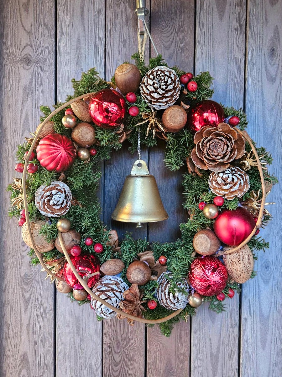 プリザーブドグリーンのベースに、赤いオーナメントをあしらったオーソドックスなカラーリングのリースです。