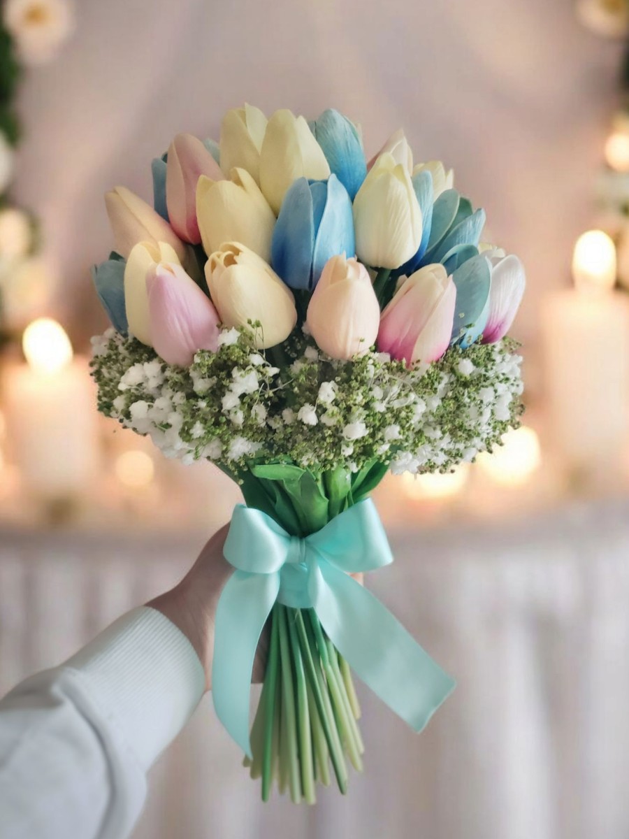 3色のパステルカラーのチューリップを束ねた、優しい雰囲気のクラッチブーケです。