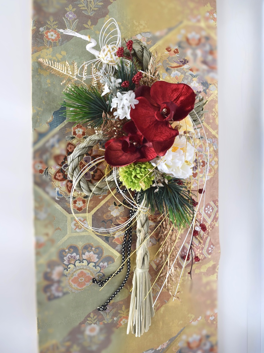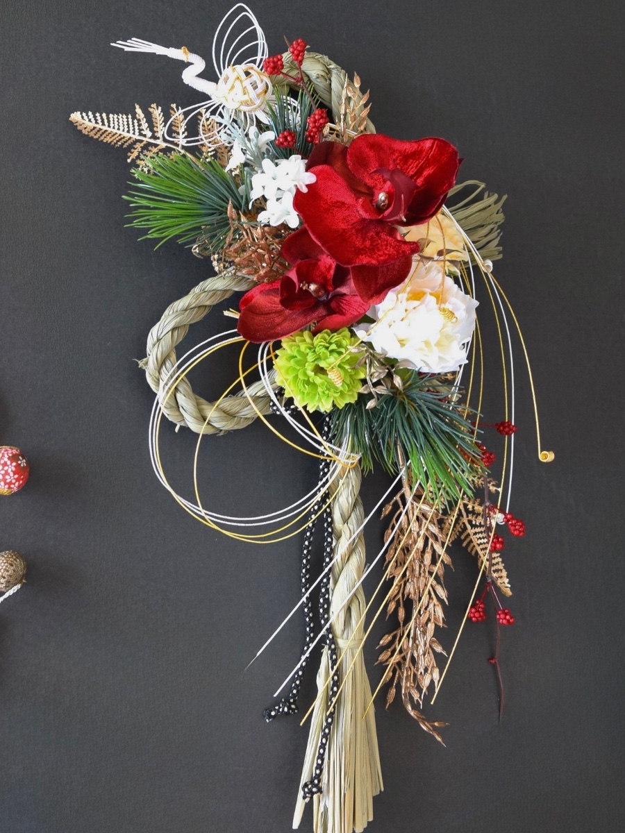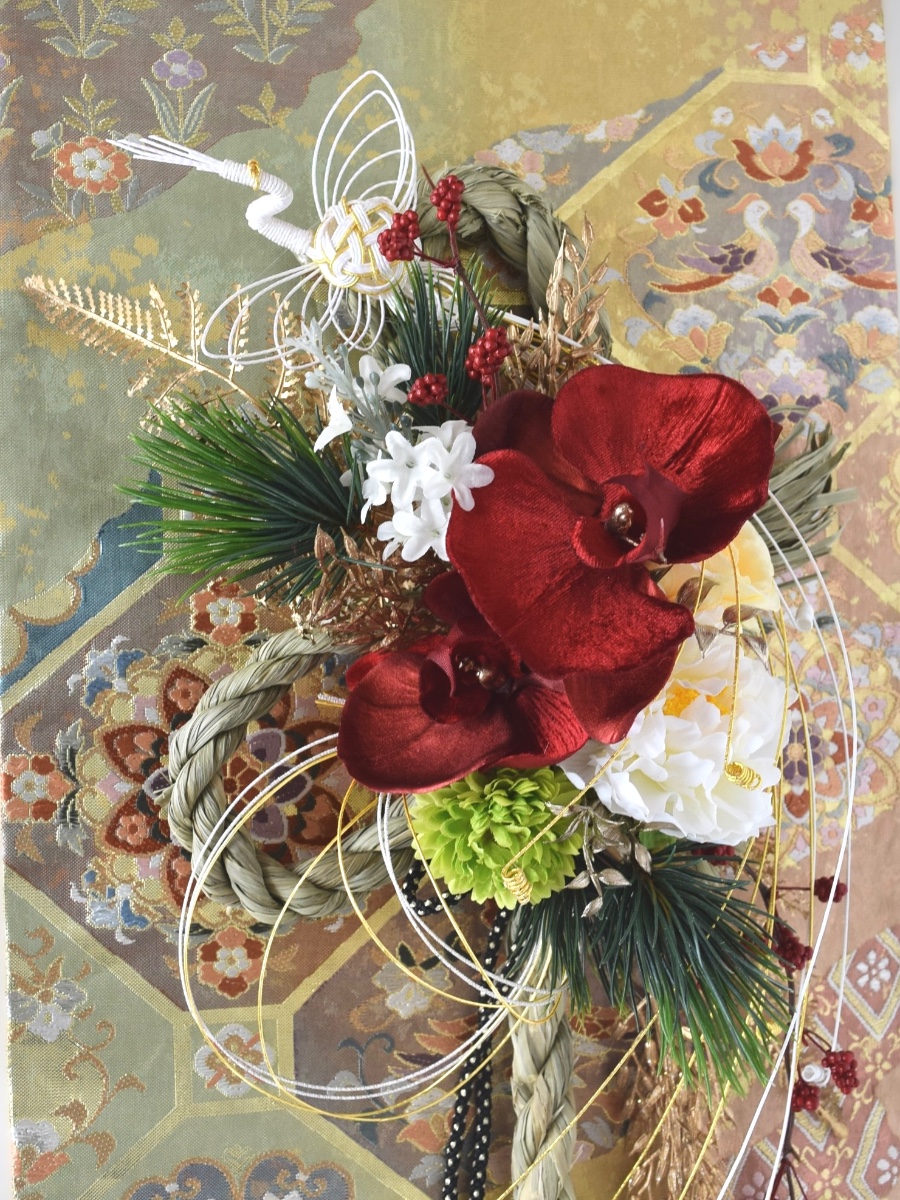 胡蝶蘭・芍薬・マム・バラなどを組み合わせた華やかなしめ縄飾りです。
