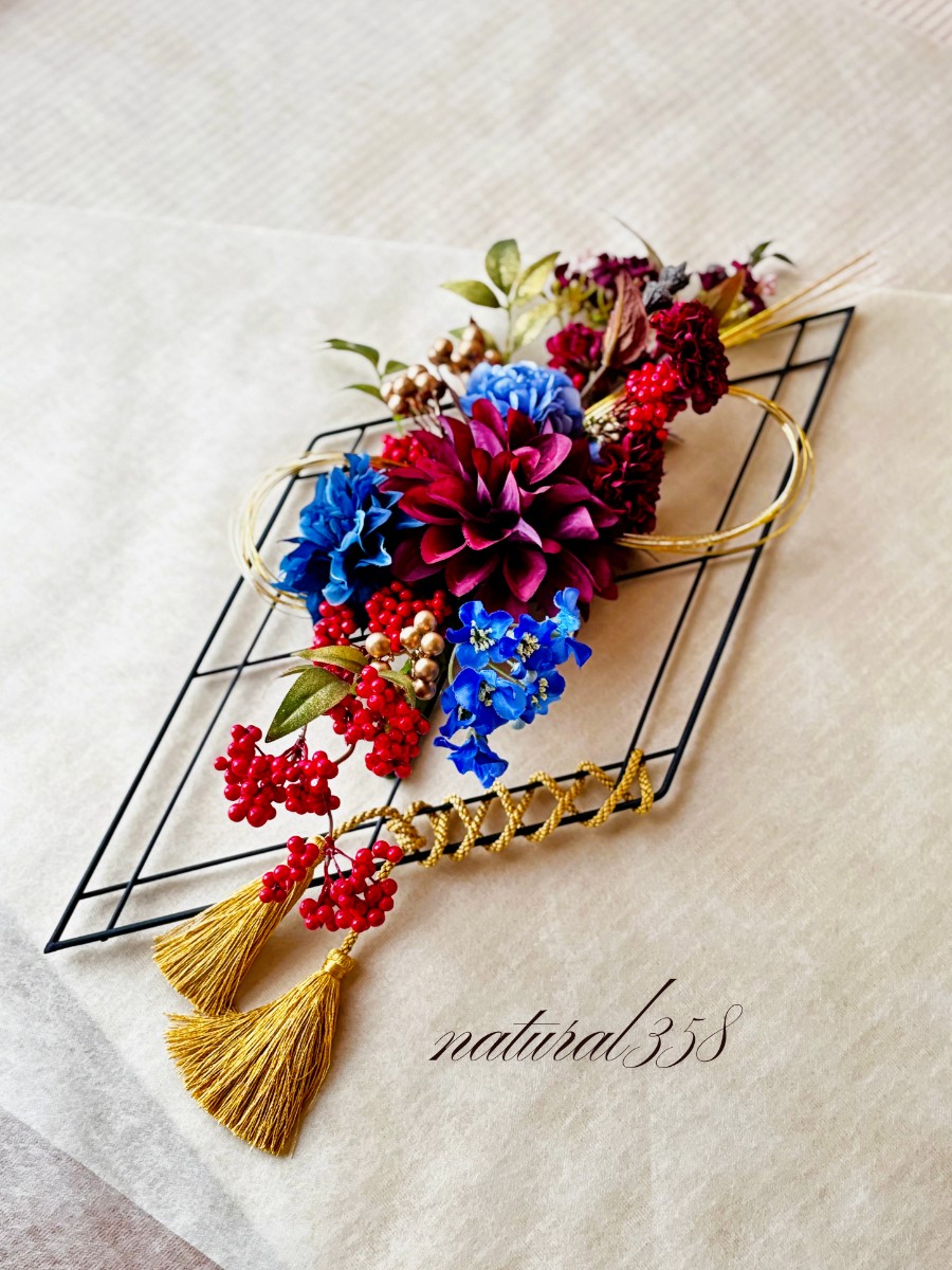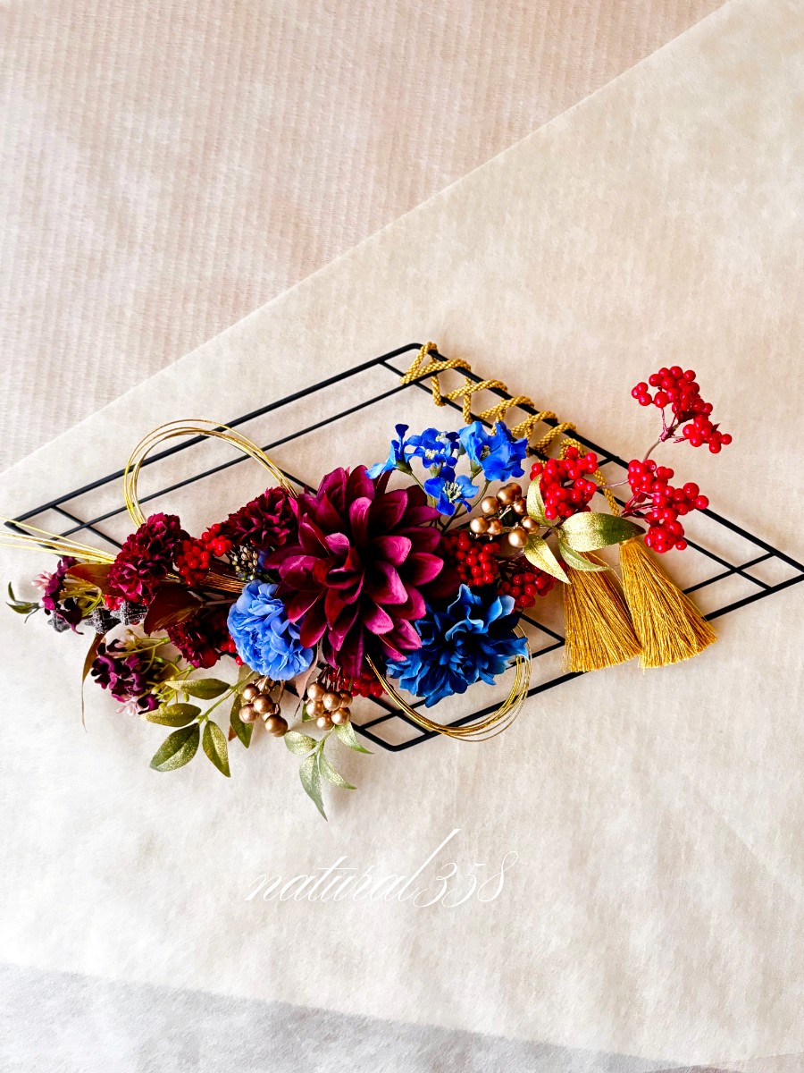 2026年のラッキーカラーである赤・青・ゴールドを使い、華やかに仕上げたフレーム飾りです。ご希望とおまかせを組み合わせたオーダーメイドの一品です。