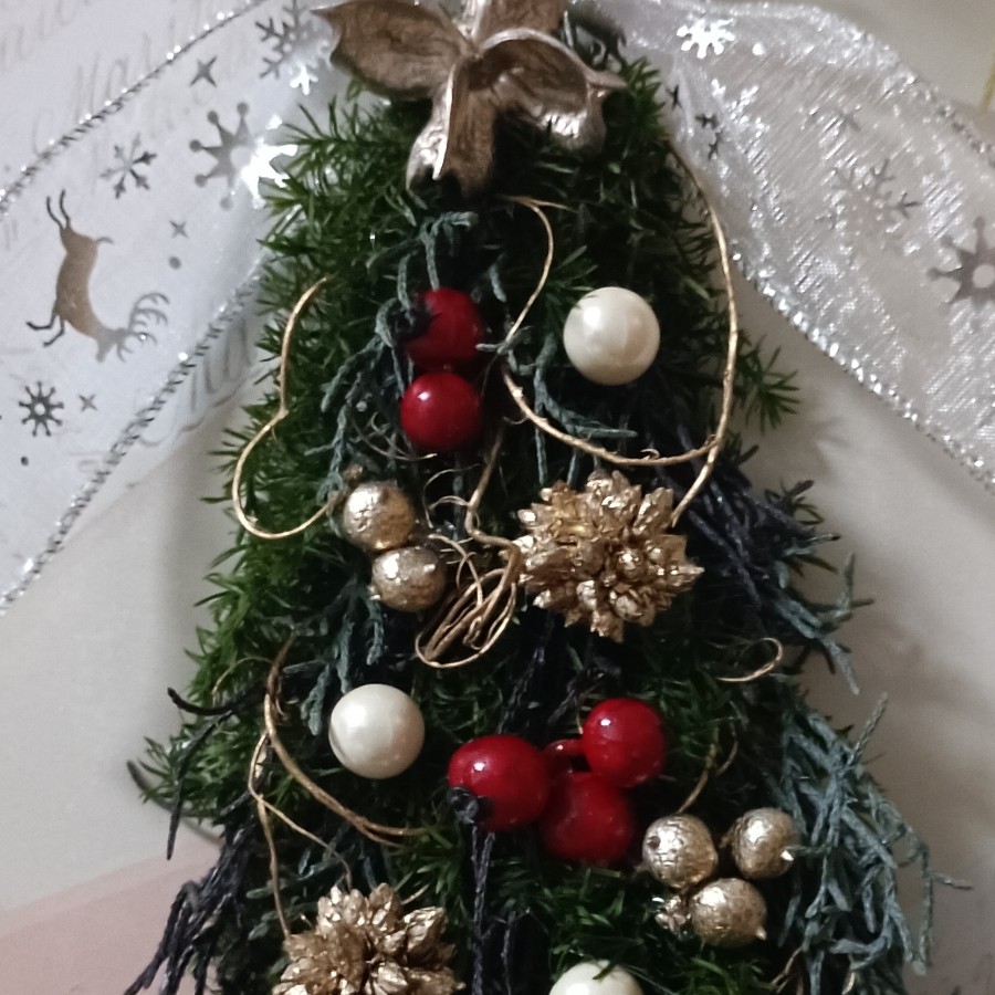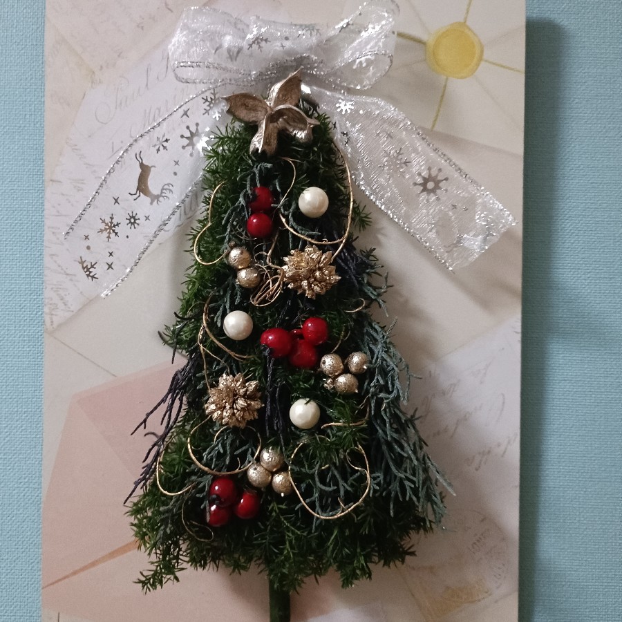 フレームにプリザーブドフラワーのヒムロスギ、ヒバ等でツリーを作りました。
