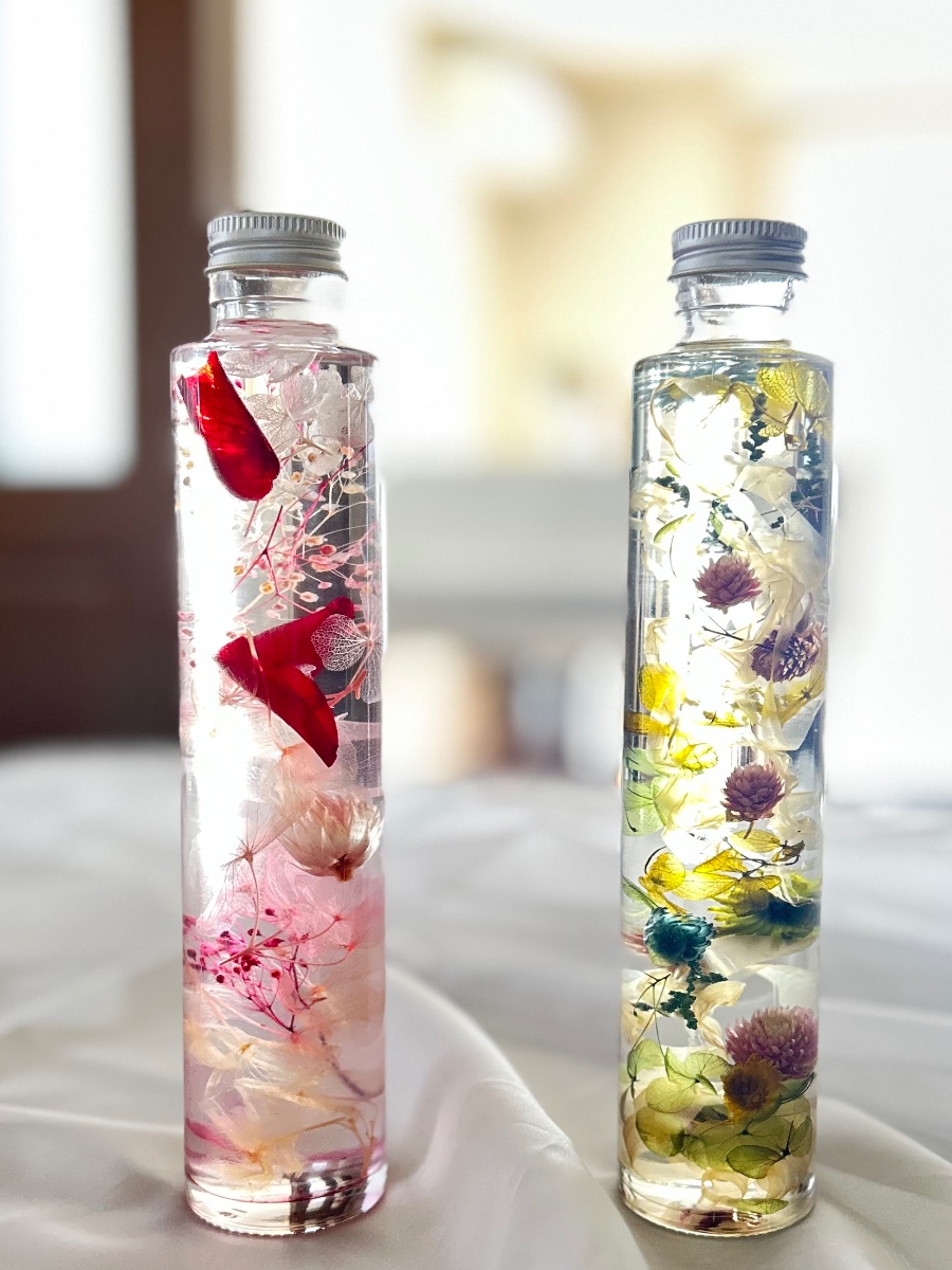 ピンクと赤、グリーン系など同系色で合わせたシンプルなハーバリウムです。