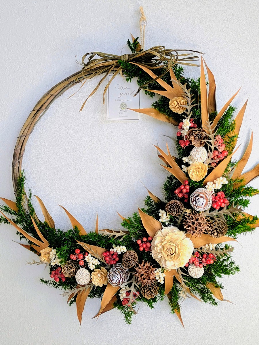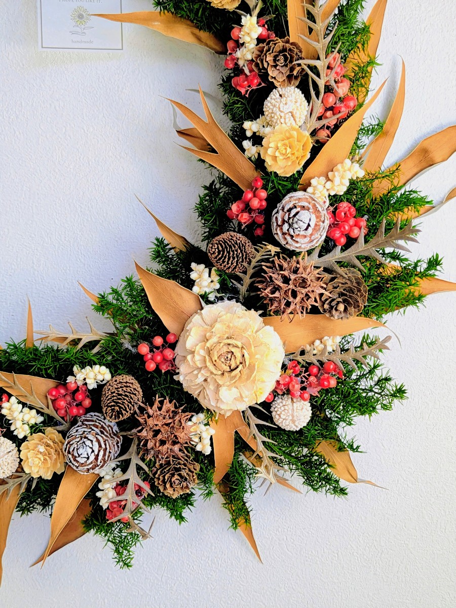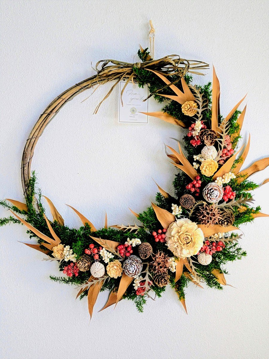 グレビレアゴールドと木の実を沢山使ったクリスマス三日月リースです。ヒムロスギは色褪せしないプリザーブドフラワーを使用しています。