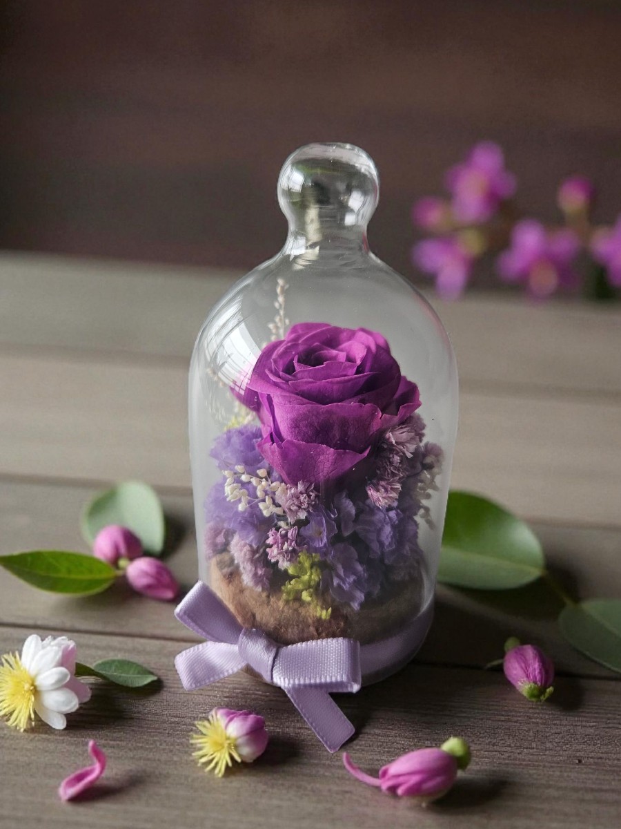 紫のバラをガラスドームに閉じこめた、小さなアレンジメントです。
