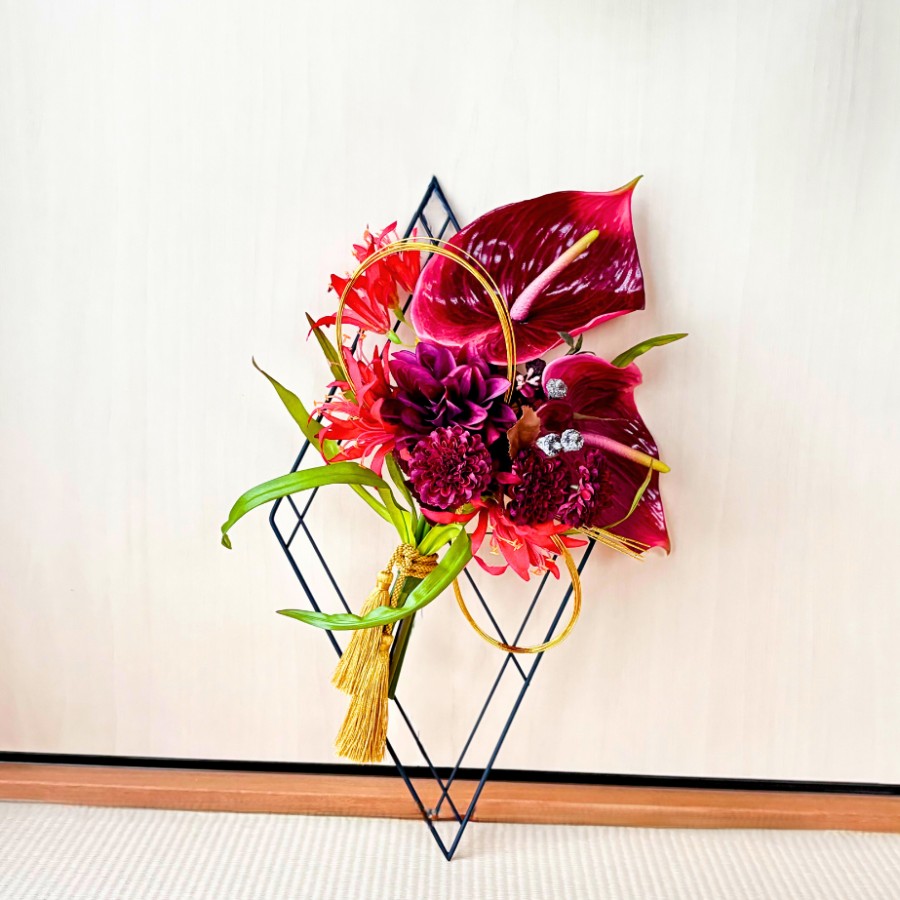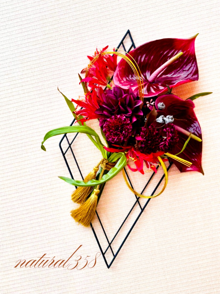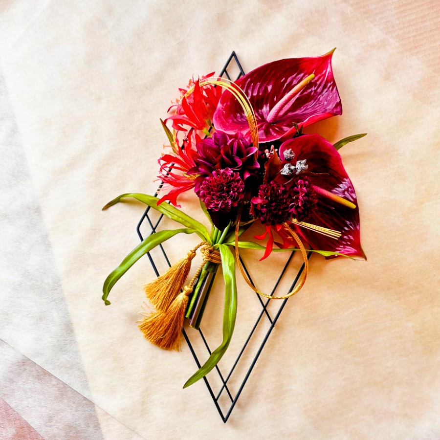赤とゴールドのアーティフィシャルフラワーで飾ったフレームは、お正月らしい華やかさを演出しています。自由にアレンジできる花や葉は、滑らかな曲線で美しく仕上げています。