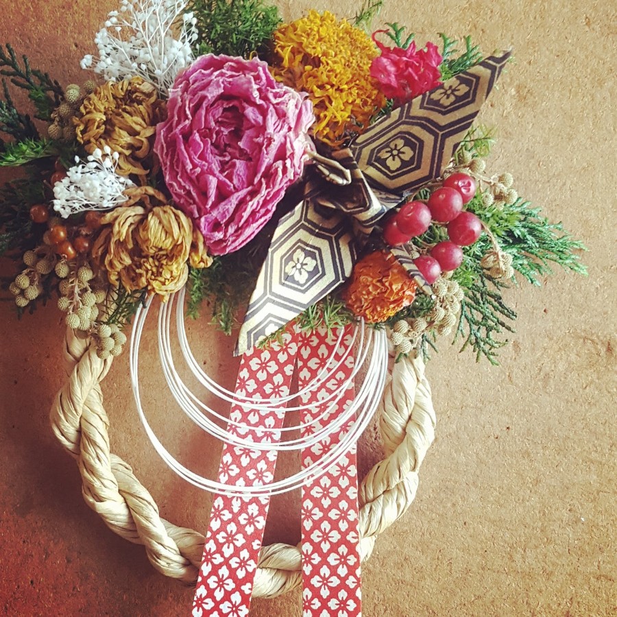 ドライのシャクヤク、ヒマワリ、キクなど、今年ドライにした残りのお花を使用した華やかなしめ縄飾りです。