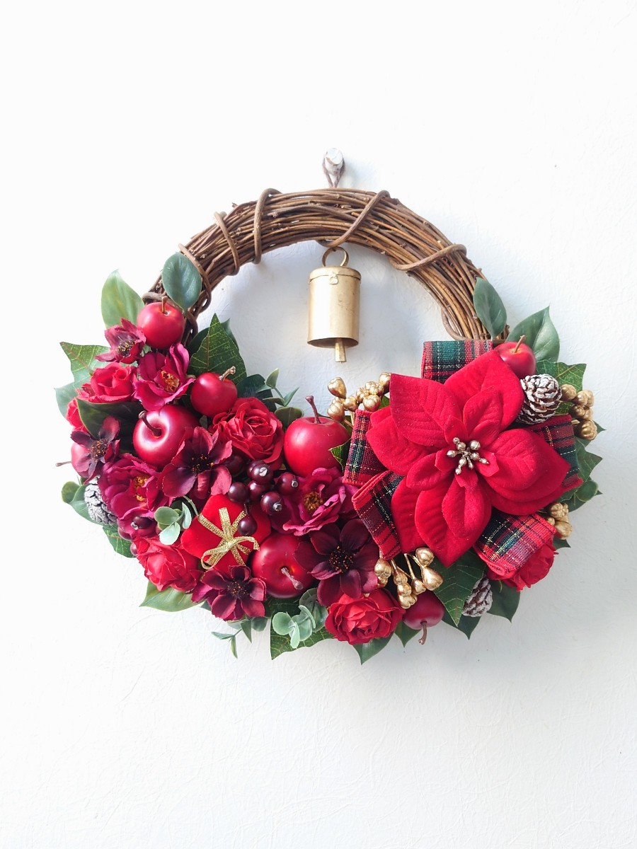 ポインセチアとローズをメインにハーフリースを組み、ベルを飾りました。