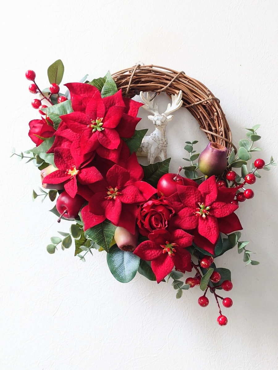 王道のポインセチアに、トナカイモチーフを飾ることで、個性的で大人な雰囲気のリースに仕上げることができました。
