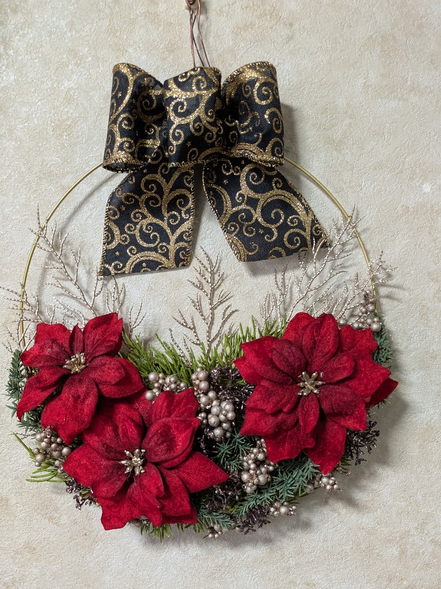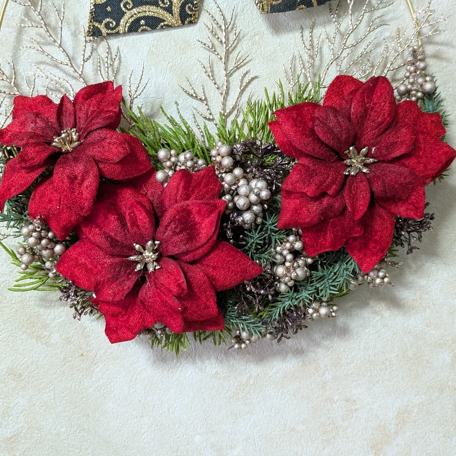 ひと昔前までは黒いリボンは縁起の悪い物としてけんえんされてきましたが 現在ではブラックのお花もリボンもあります。赤いポインセチアにブラックのクリスマスリボンが似合いました。