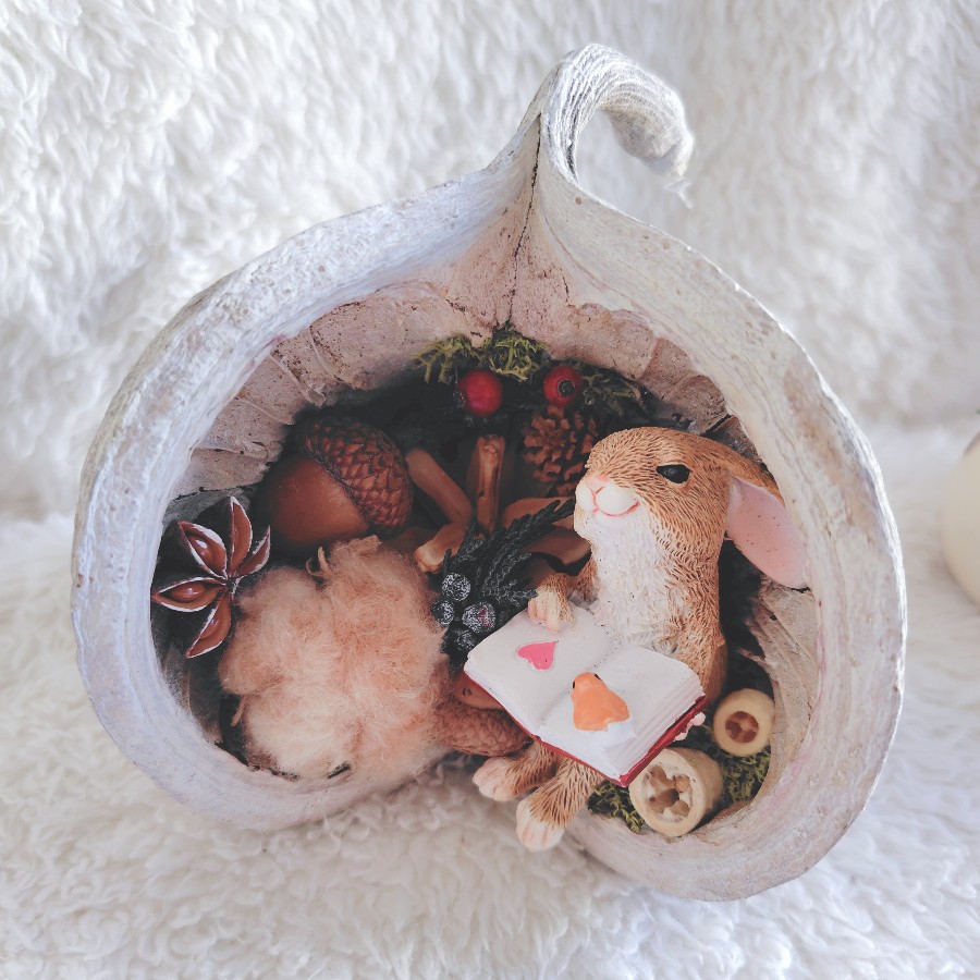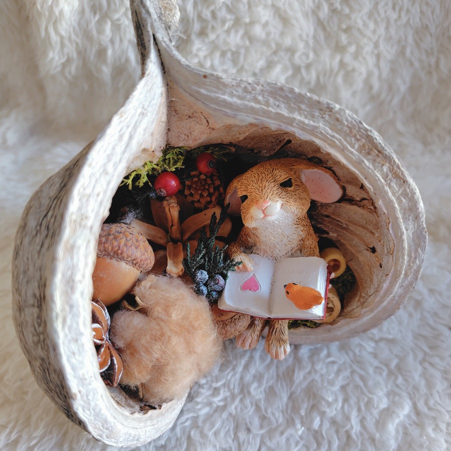 秋の木の実と可愛いらしいうさぎを大きなナッツに詰めてみたら…