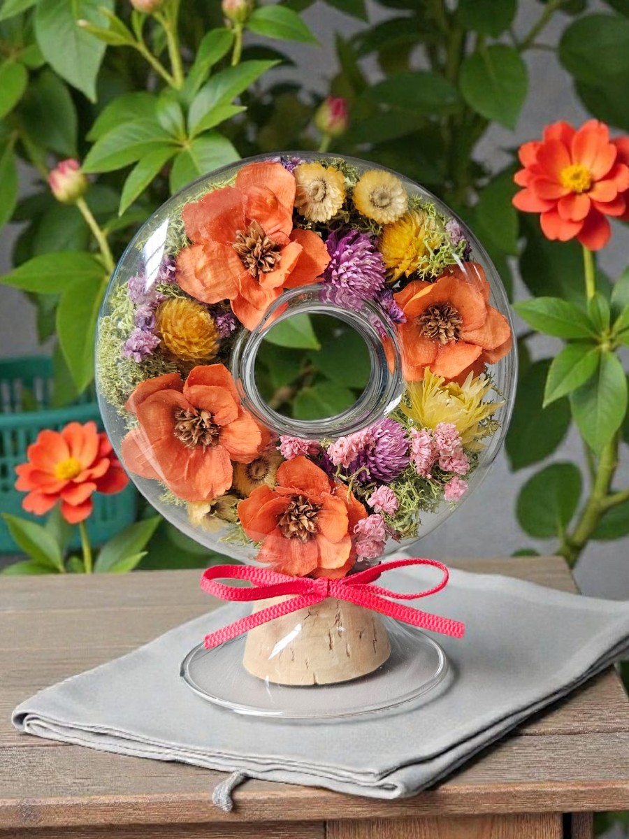 リング型のガラスボトルにオレンジや黄色のお花を詰め込んだシードボトルアレンジメントです。