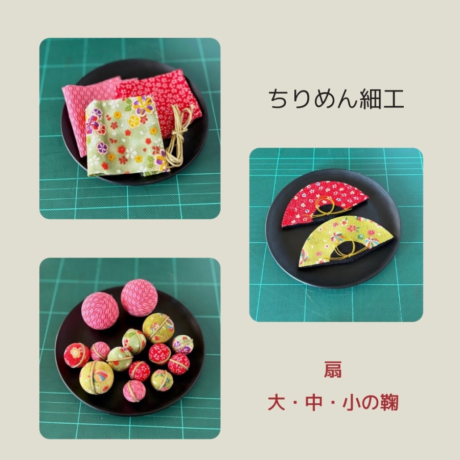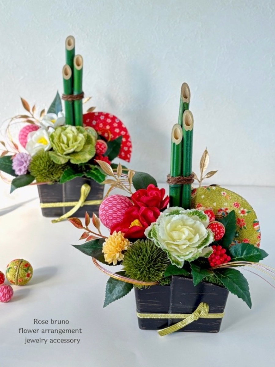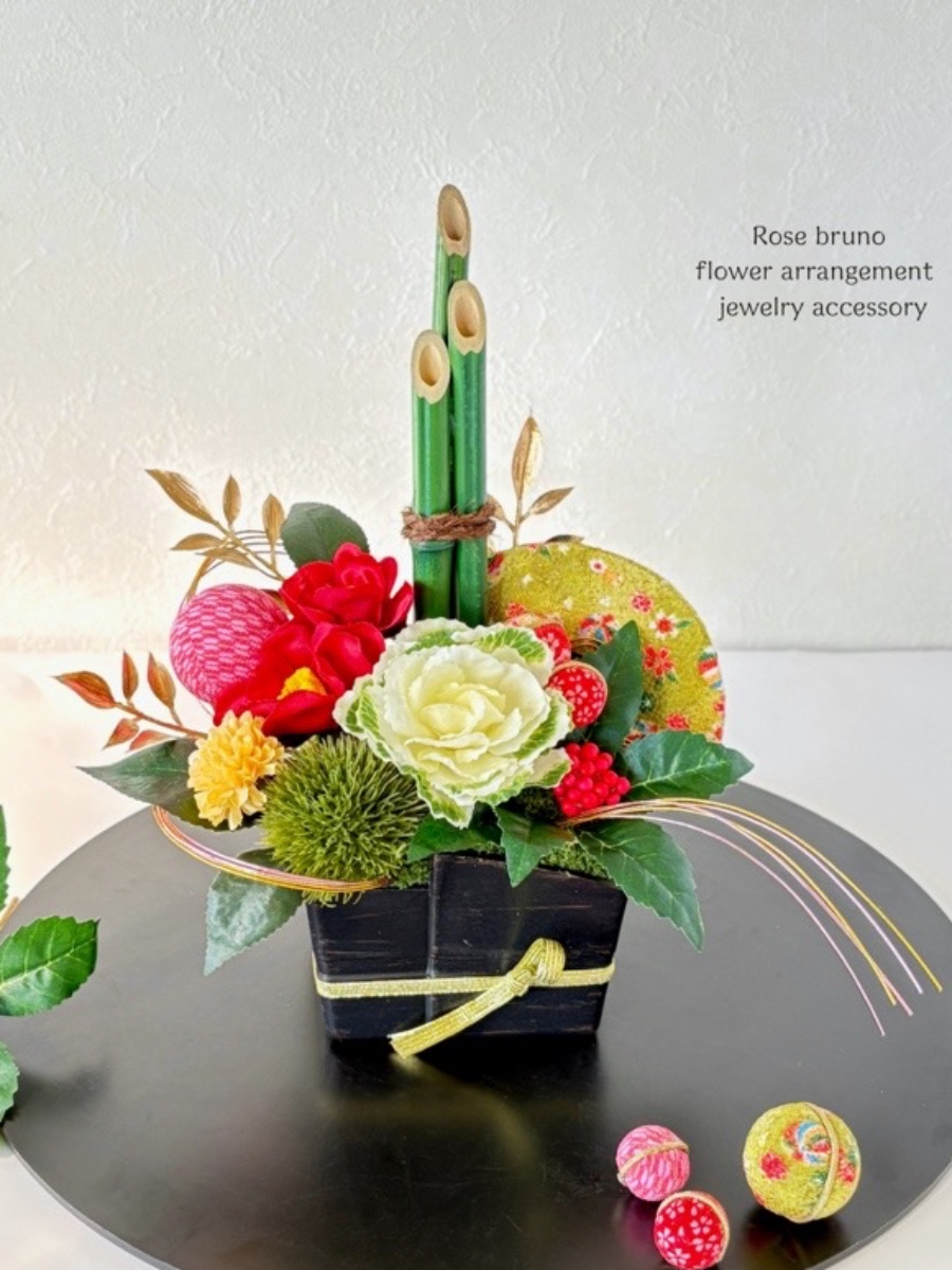 上品な和風の花器に門松やちりめんでお作りした扇や鞠を取り入れて、上品で華やかに仕上げたミニ門松飾りになります♪