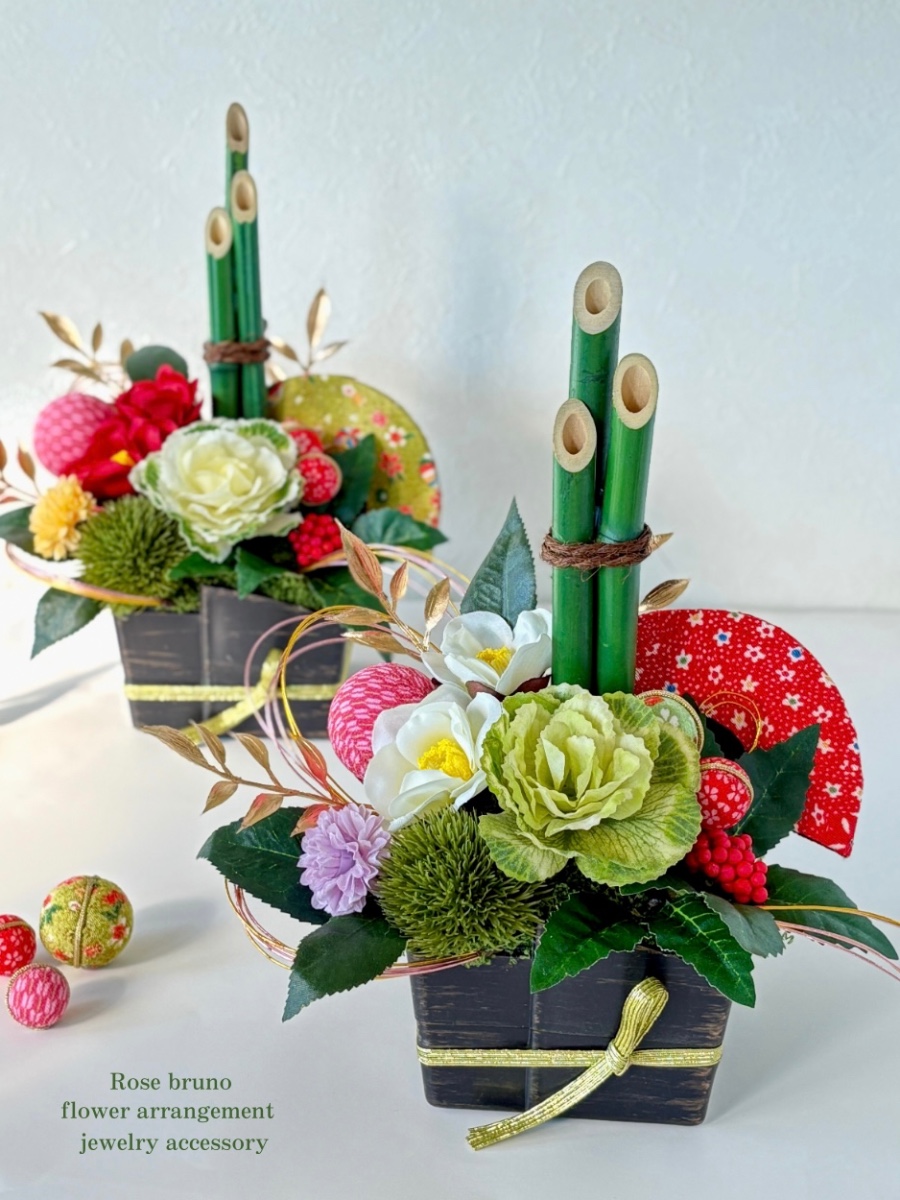 上品な和風の花器に門松やちりめんでお作りした扇や鞠を取り入れて、上品で華やかに仕上げたミニ門松飾りになります♪