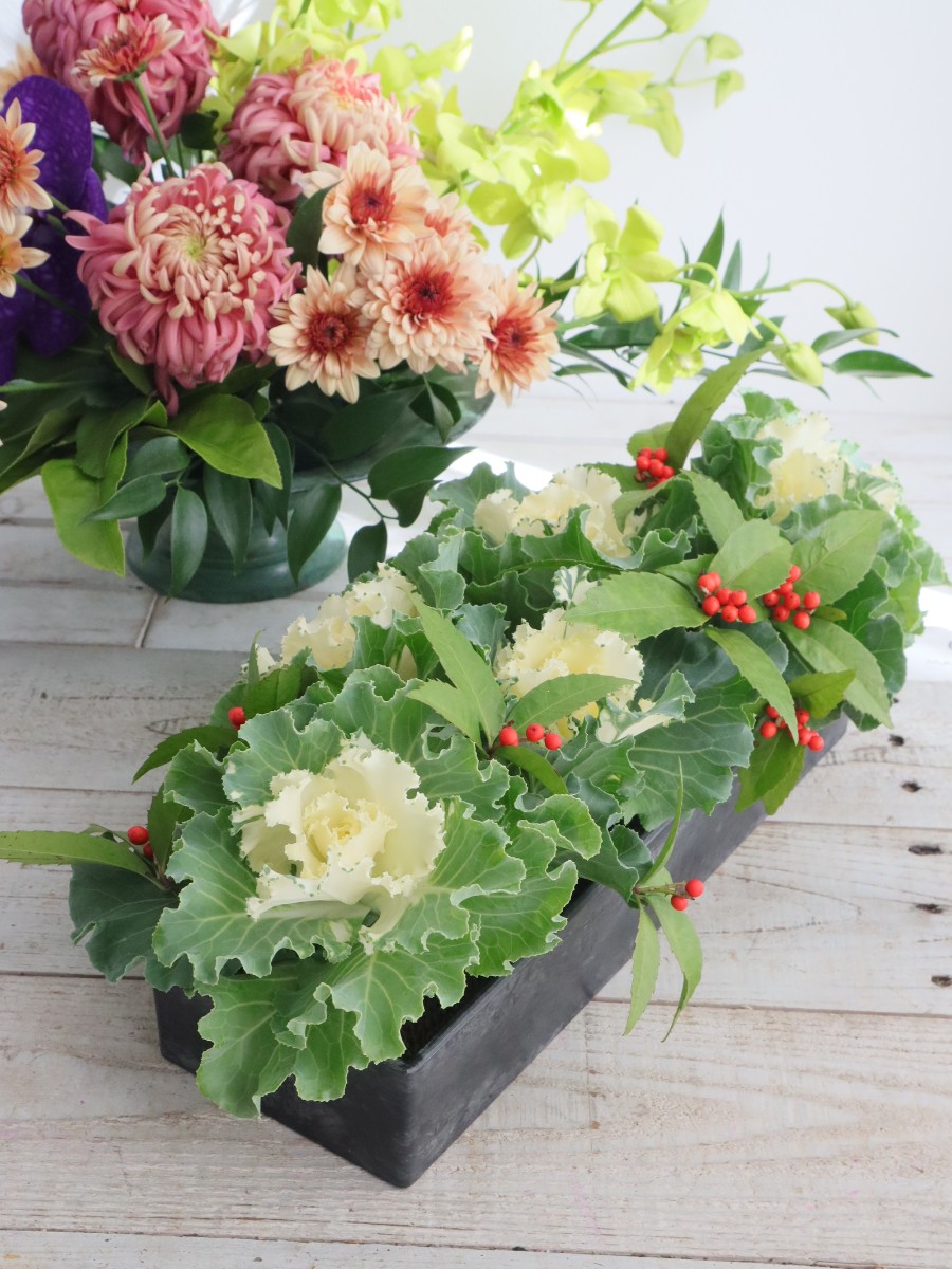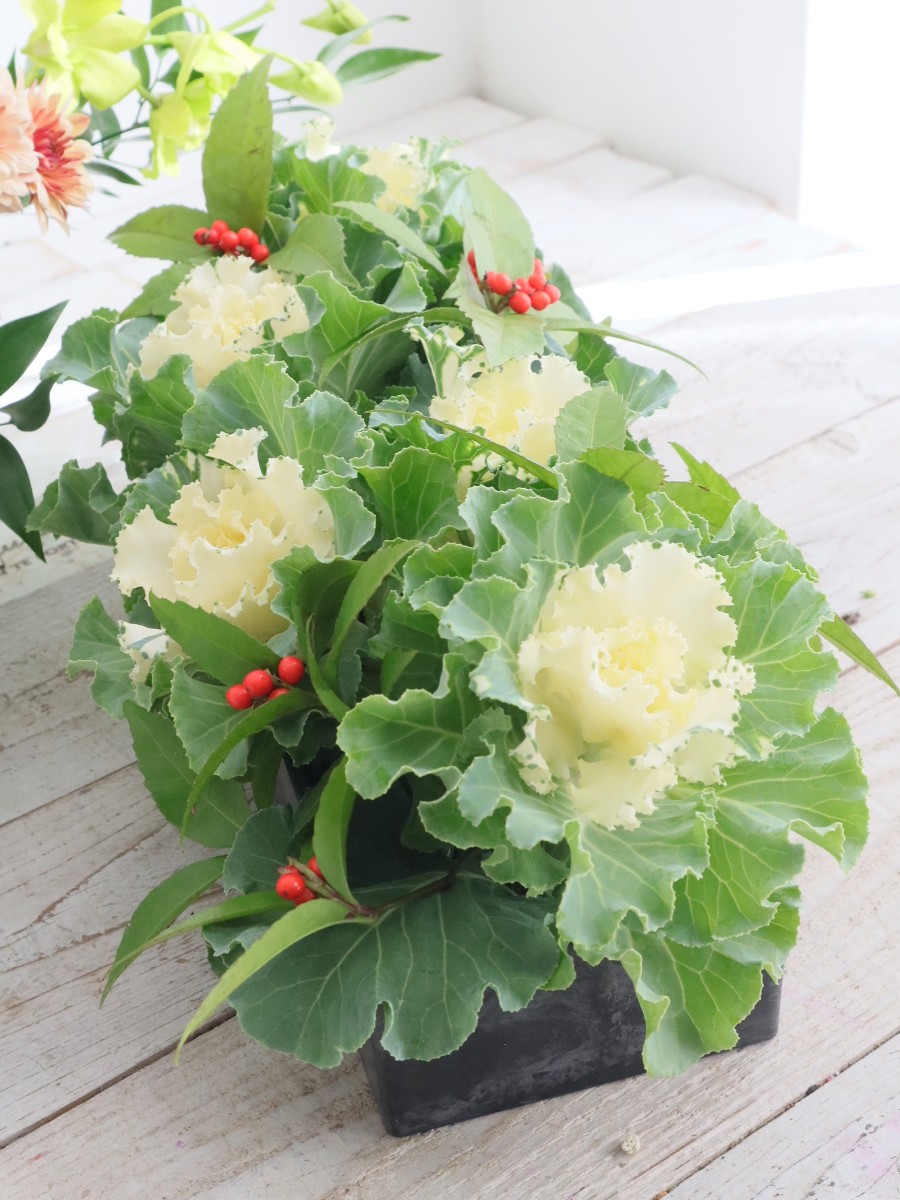 フリル葉ぼたんのテーブルアレンジ
