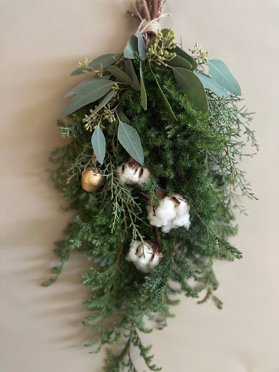 針葉樹をたっぷり束ねて雪を連想させるコットンとアイアンベルで華やかさを添えました。