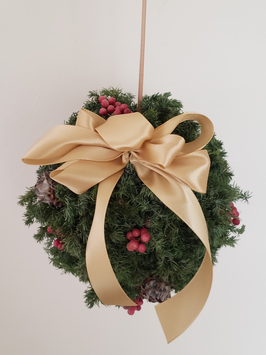 ヒムロ杉とコニファーブルーバードをたっぷり使って作った、森の香りが清々しいクリスマスボールです。雪を被った松ぼっくりのように見えるのはリューカデンドロです。