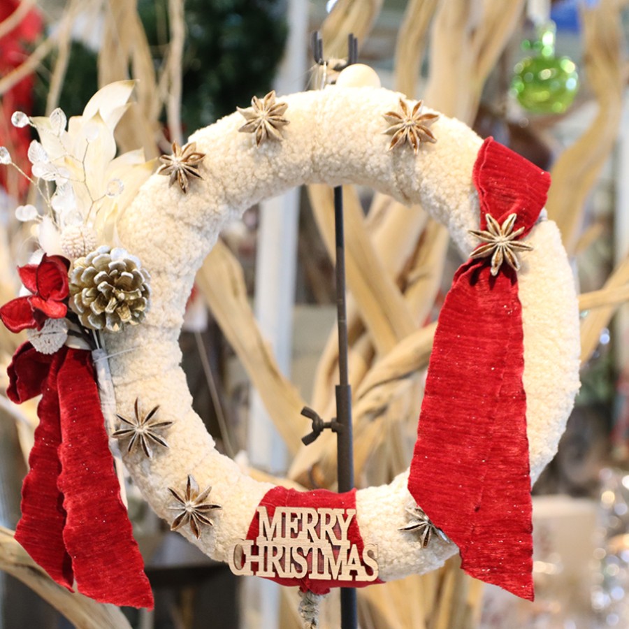 もこもこな質感が可愛いリースベースに、首元からたれるベルがおしゃれのポイント!