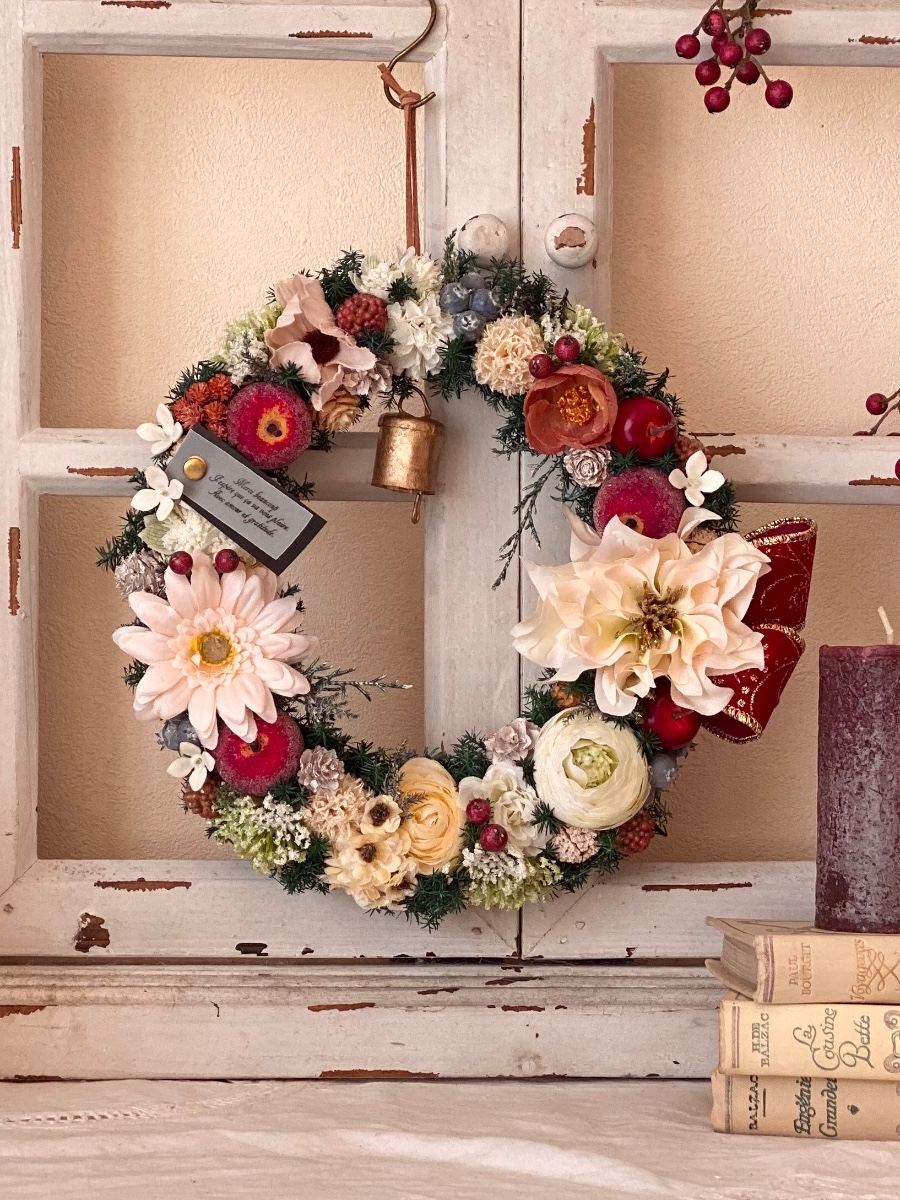 『ひだまりの猫』定番の花いっぱいリースのクリスマスver.になります。