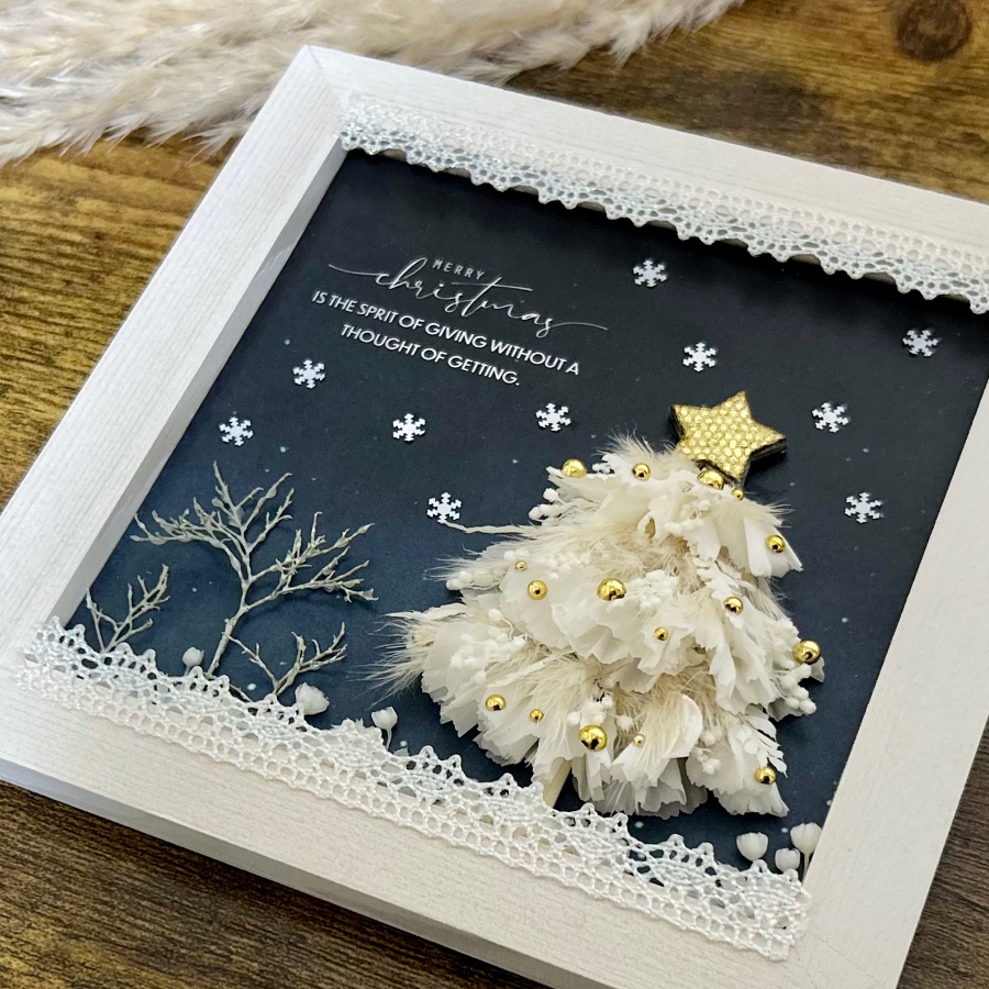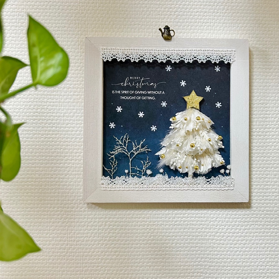 白いお花たちを使って小さなクリスマスツリーを描きました。