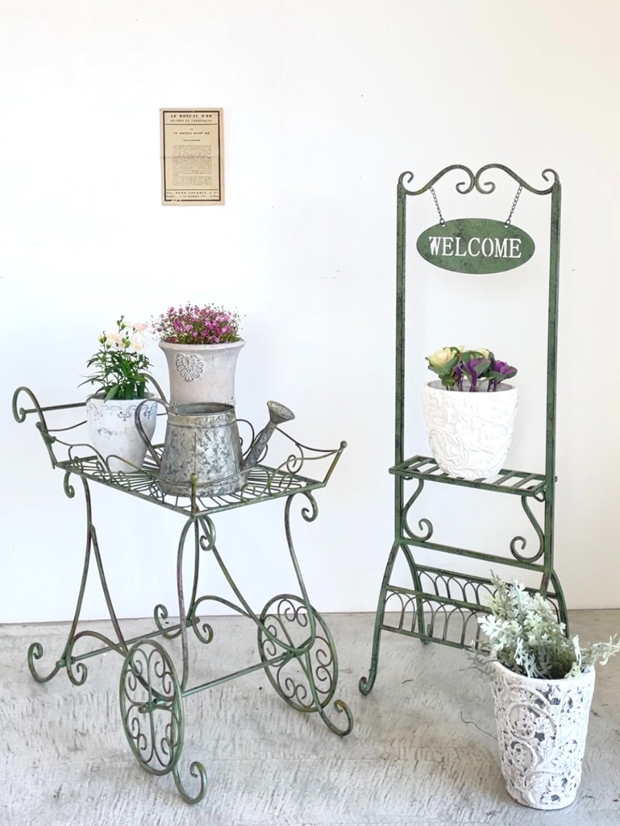 シャビーな風合いのグリーンのアイアン素材で、装飾的なラインが印象的。