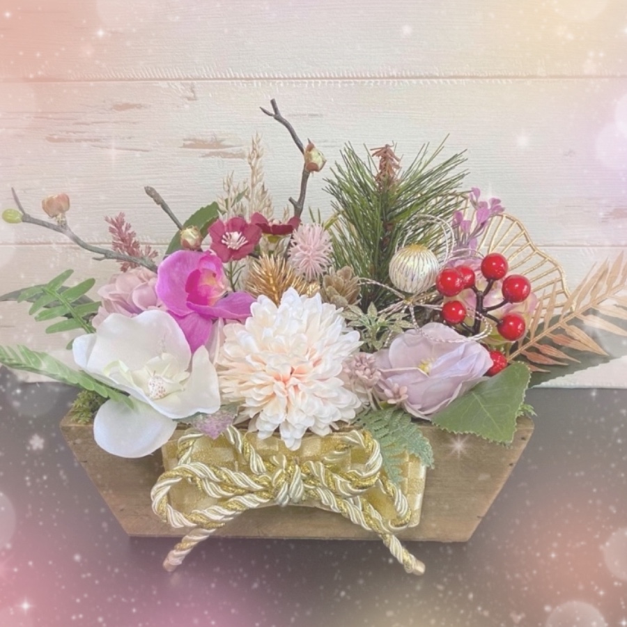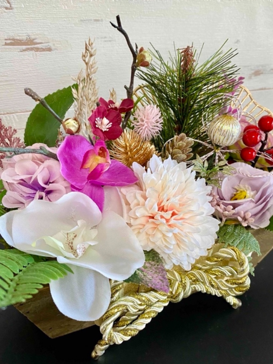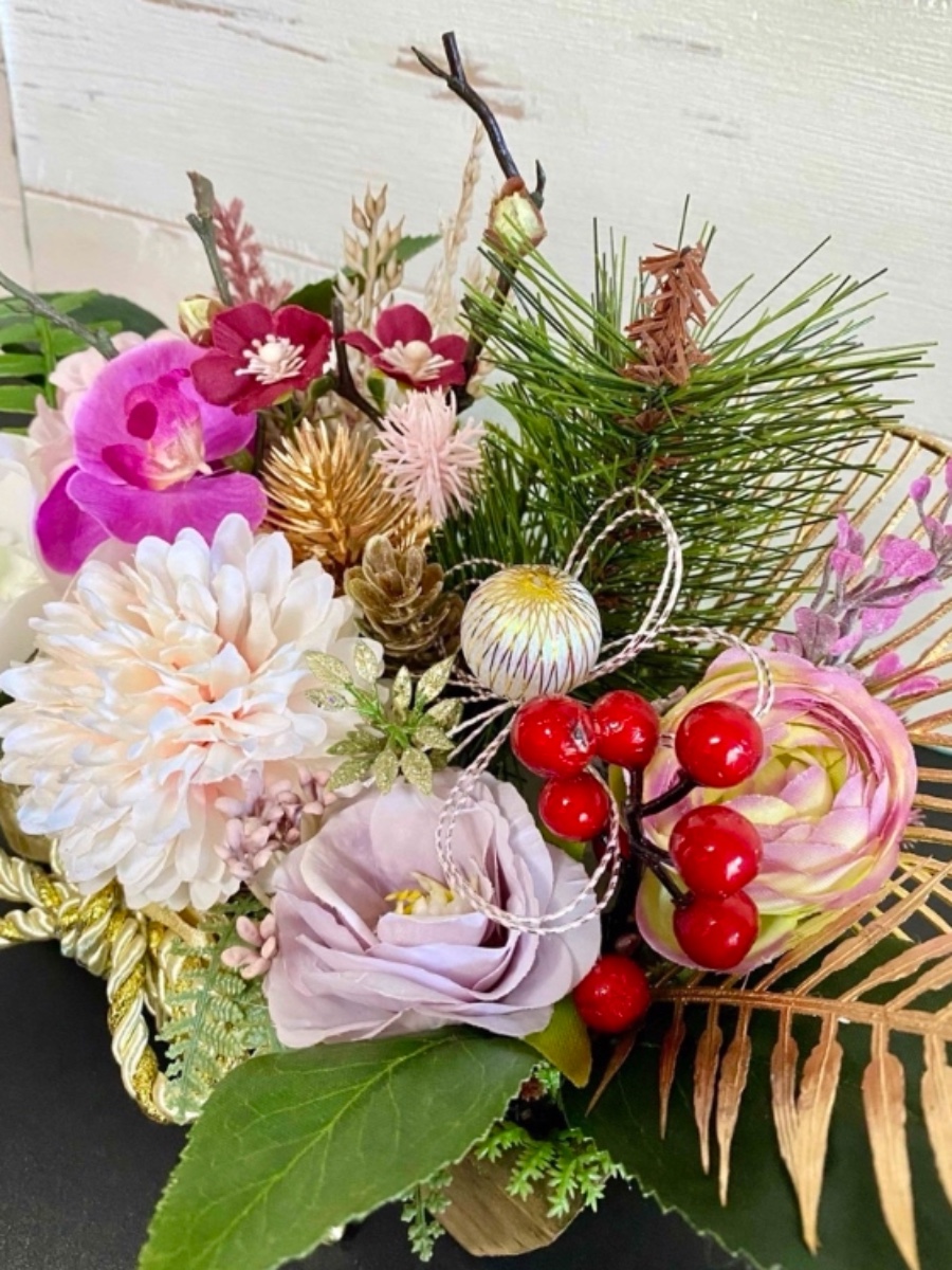 胡蝶蘭やマム、松・梅などを使って華やかな和モダンお正月アレンジに仕上げました。