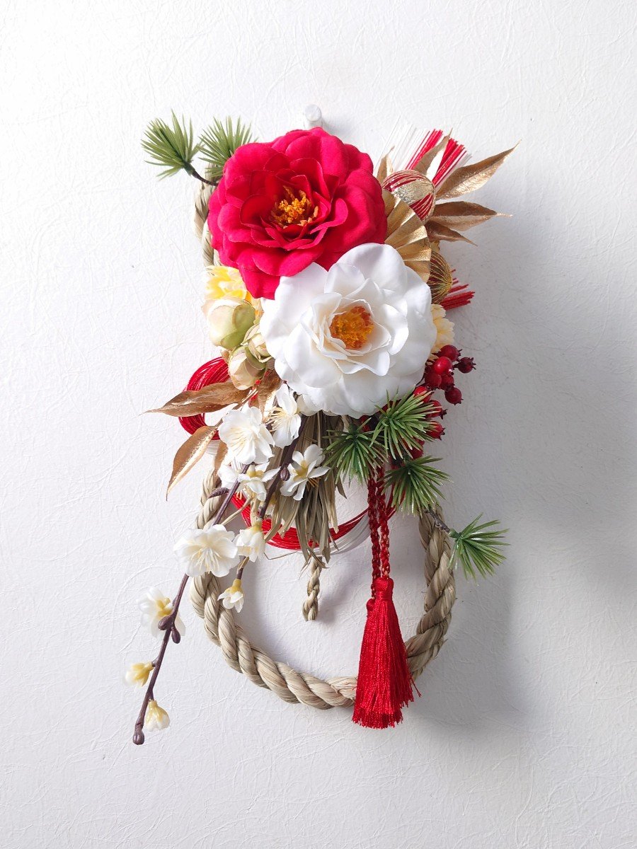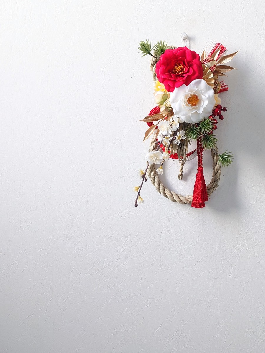 紅白椿に松、梅、南天も添えた、シンプルながら華やぎのあるお花のしめ飾りです。