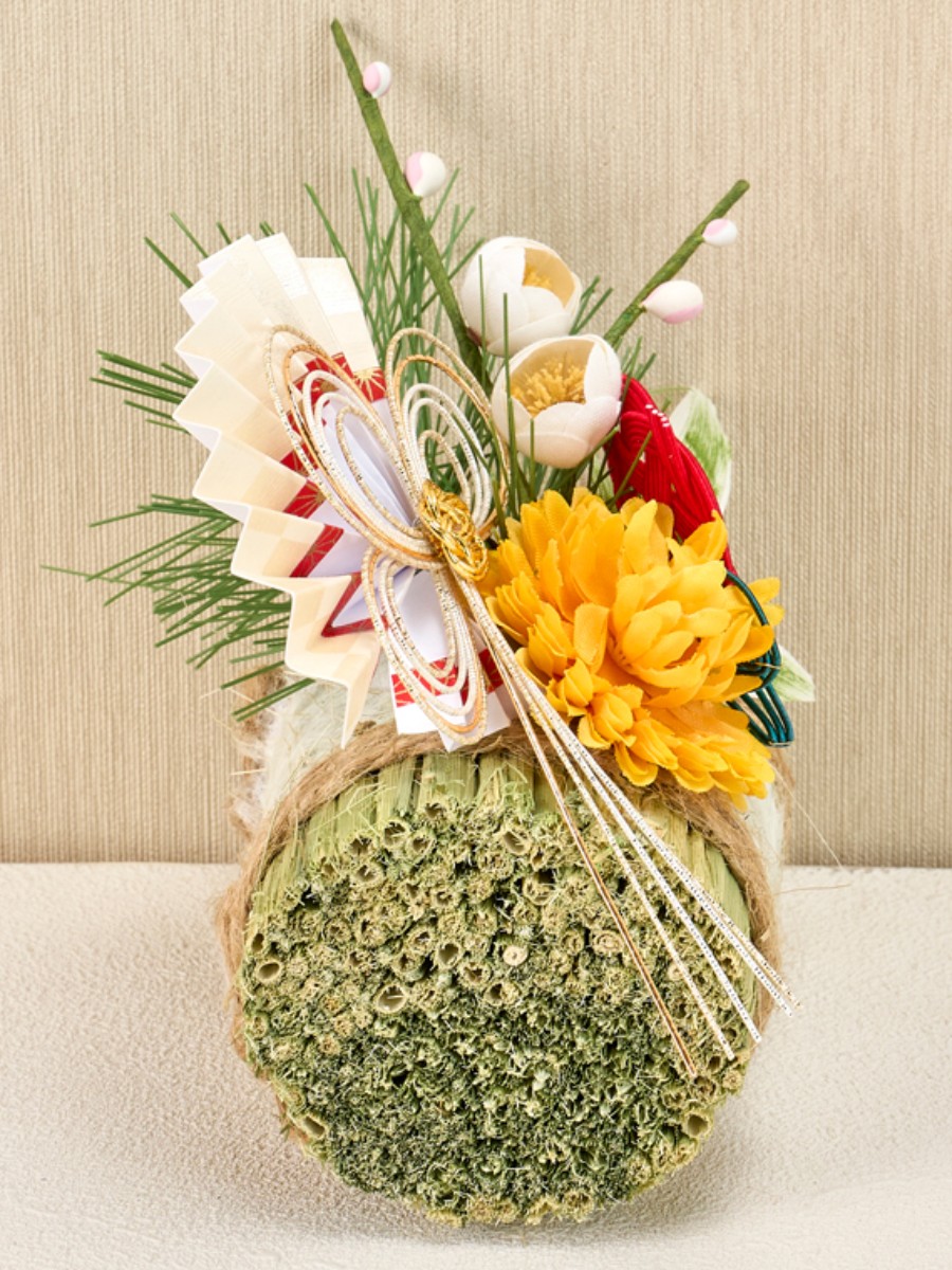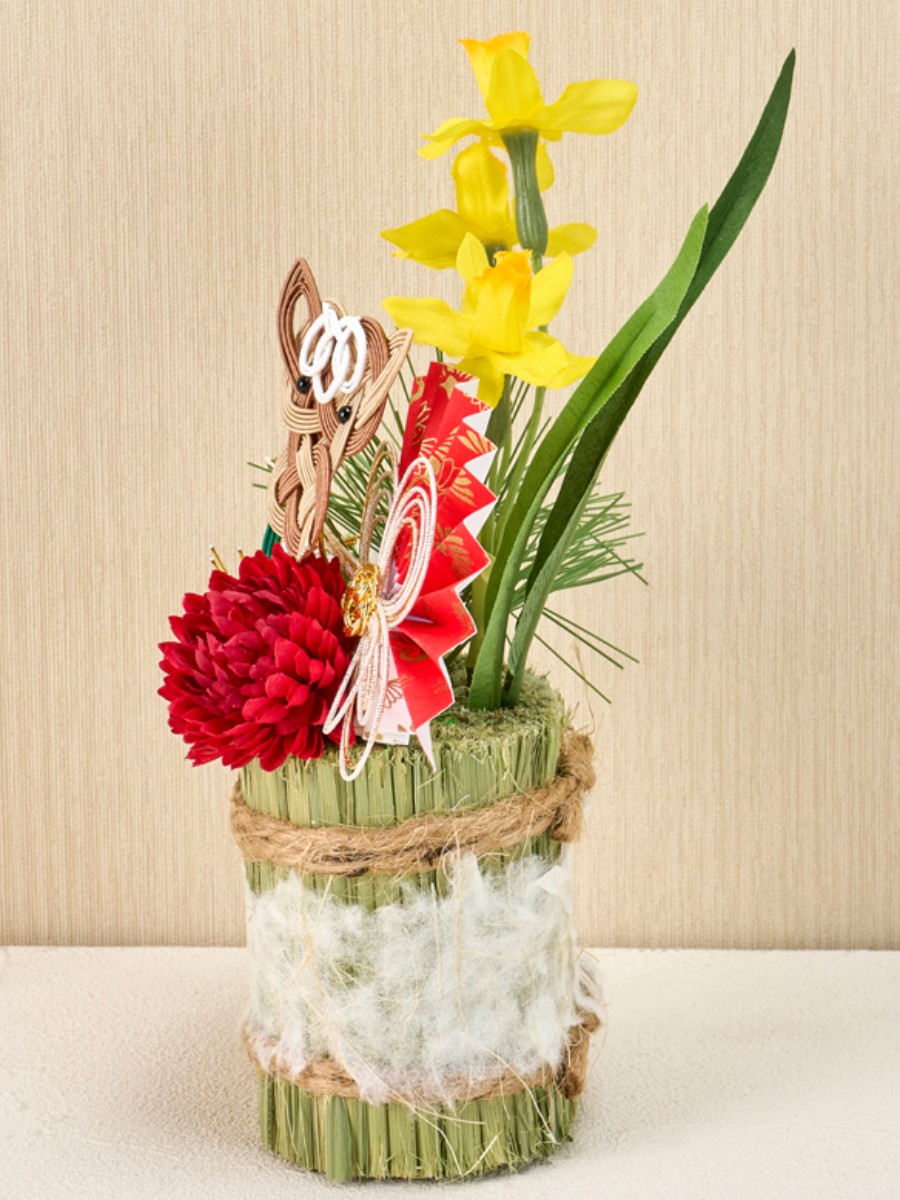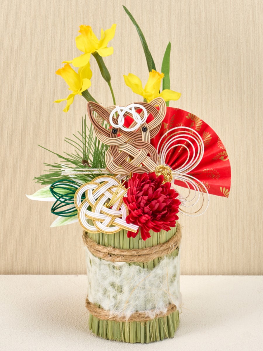 「縦型」:花材は少な目にして正月パーツをたくさん使いました。