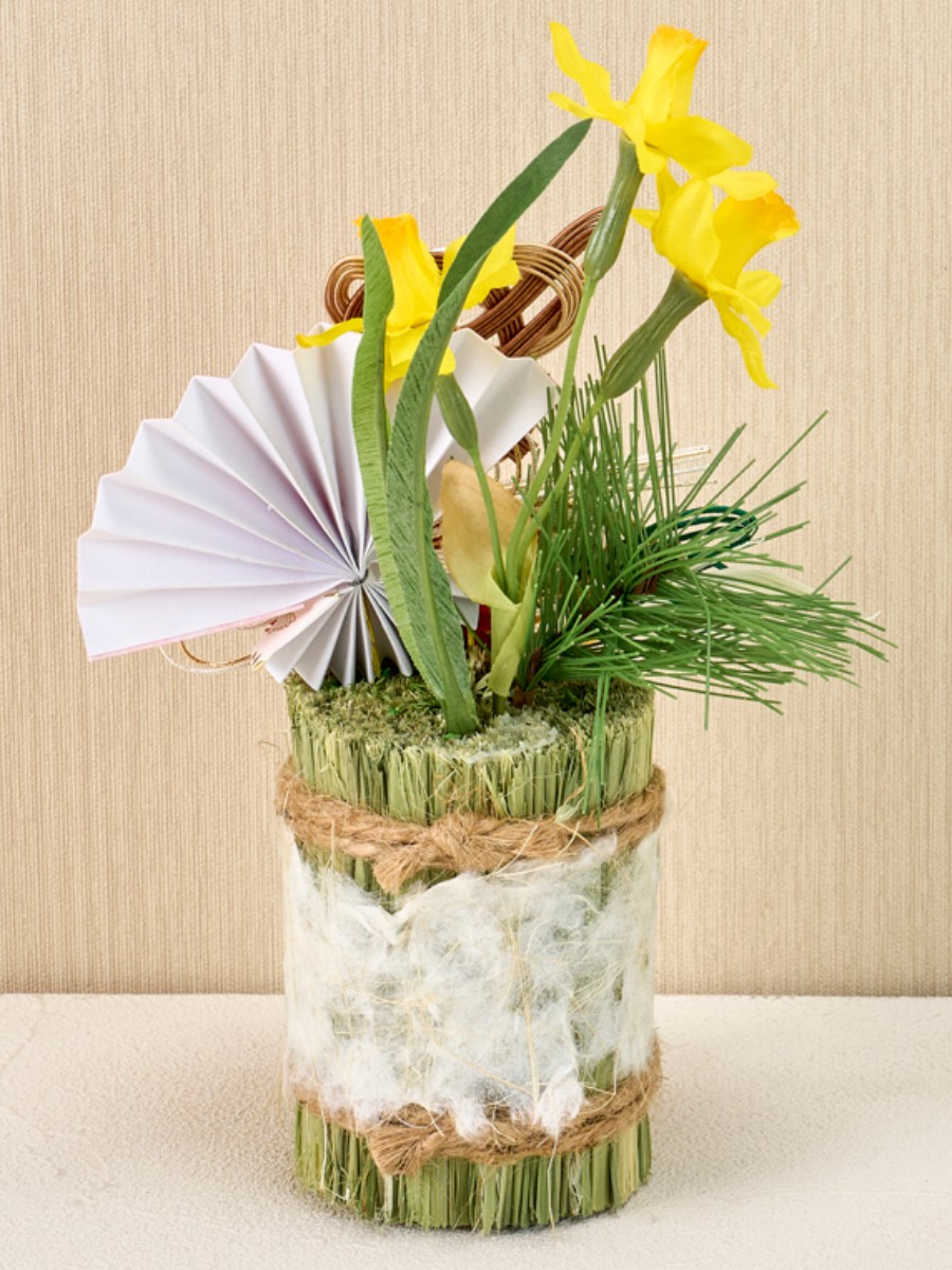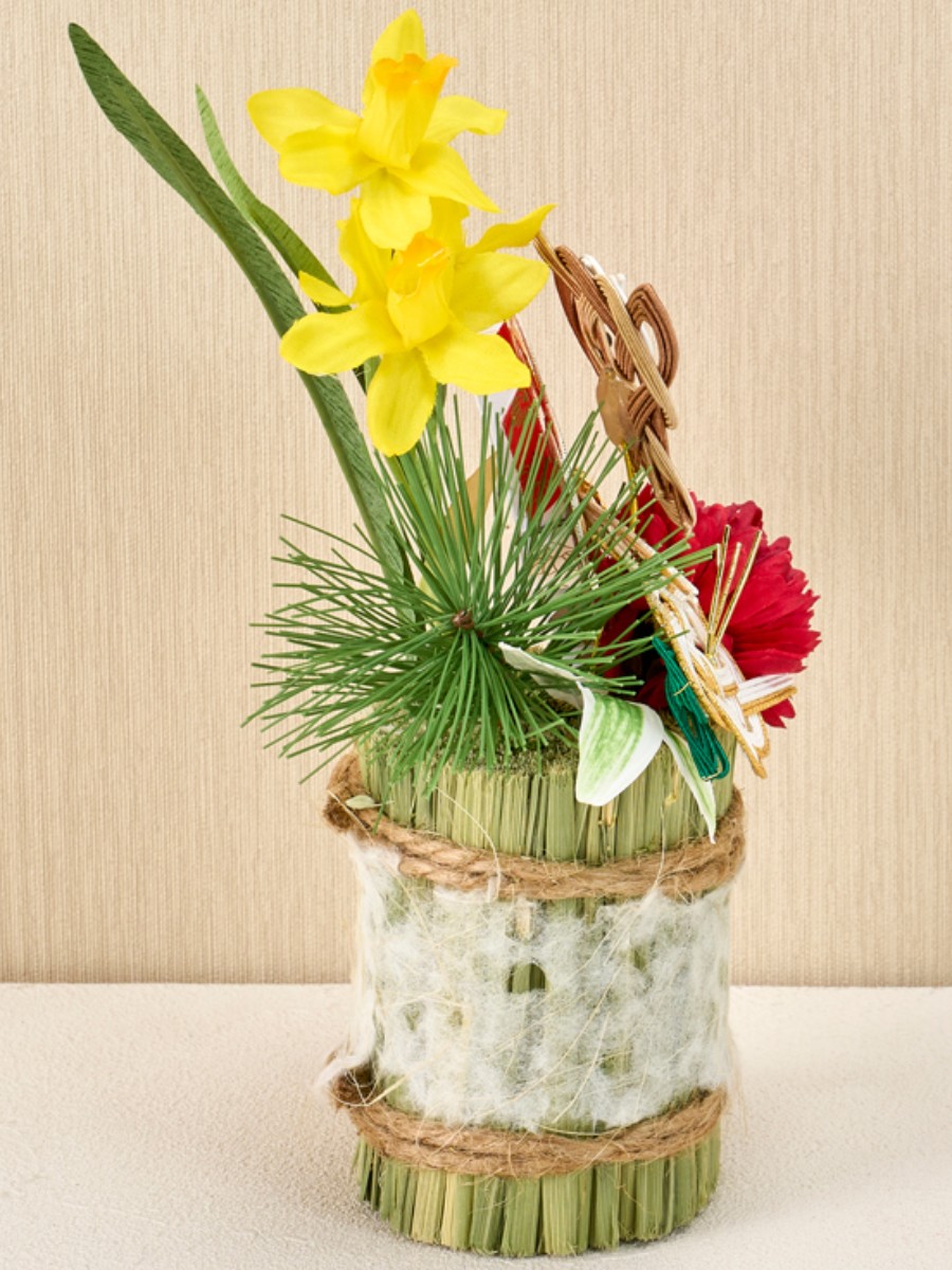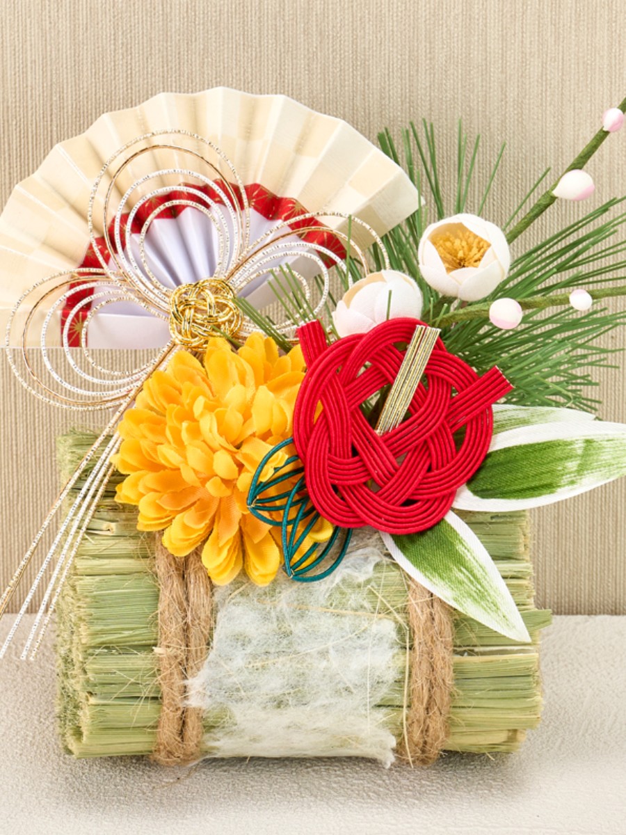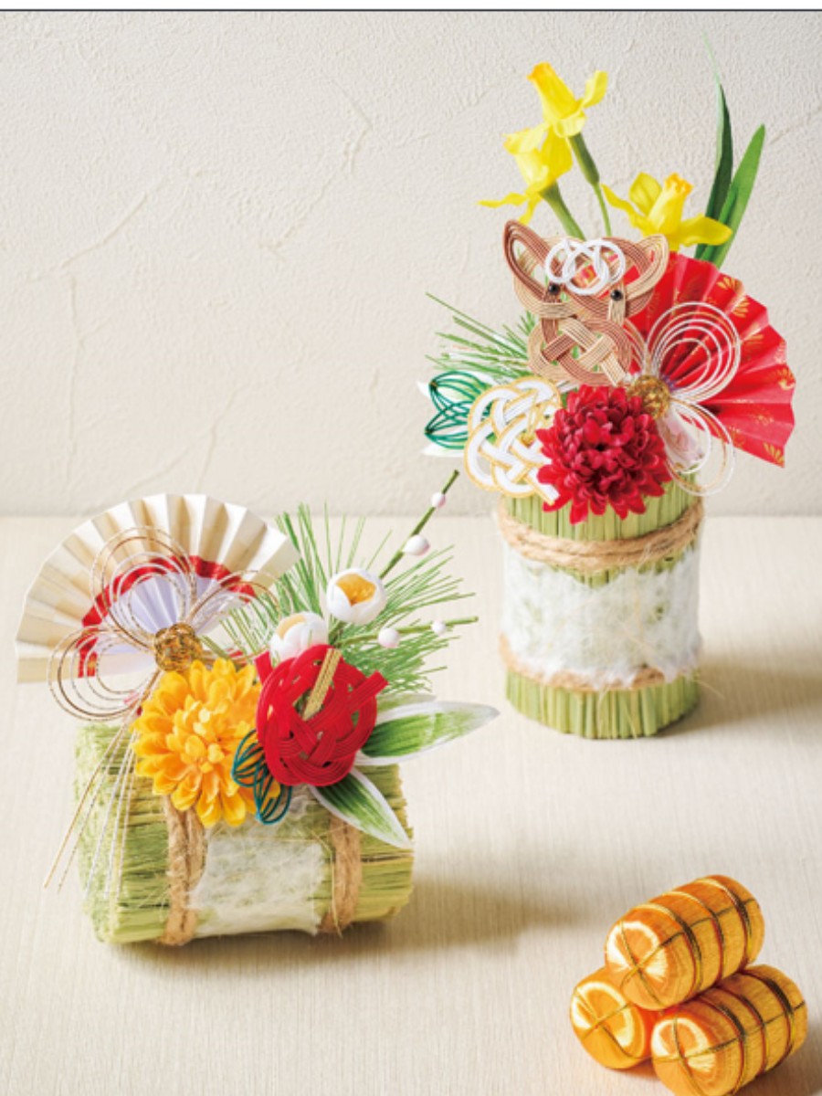 「縦型」:花材は少な目にして正月パーツをたくさん使いました。