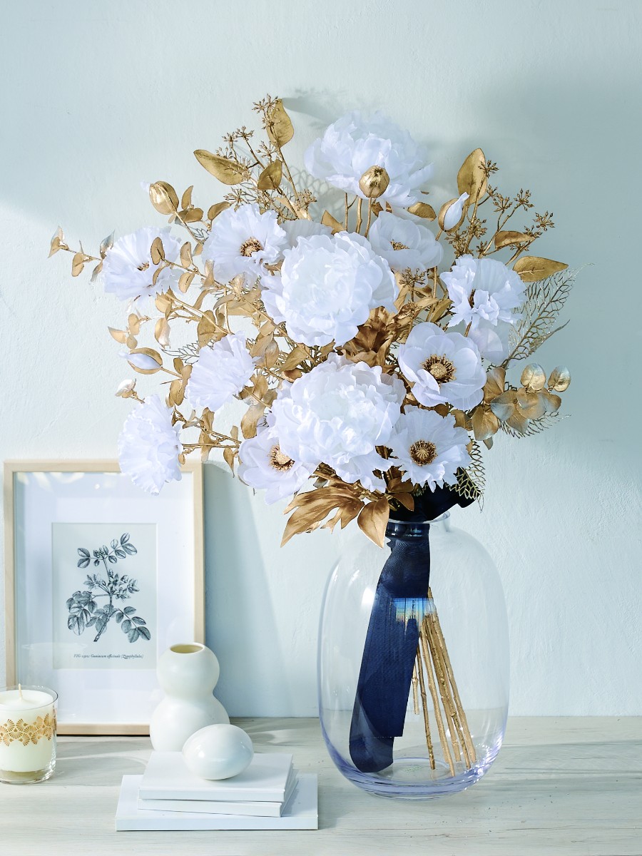 ホワイトとゴールドが織りなす正月フラワー。ピオニーやアネモネ、ポピーを不織布で軽やかに仕上げ、ステムをゴールドにすることで上品さを演出しました。優しい雰囲気のアイテムなので、ふわっと花束みたいに束ねてインテリアにもオススメです。アレンジのアクセントにネイビーのリボンをあしらい、大人っぽく仕上げました。空間全体が優しく華やぎ、新年らしいアレンジです。