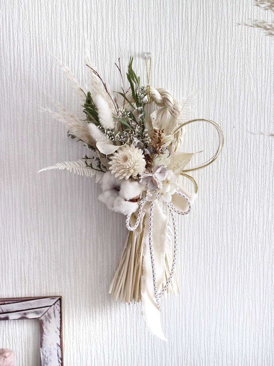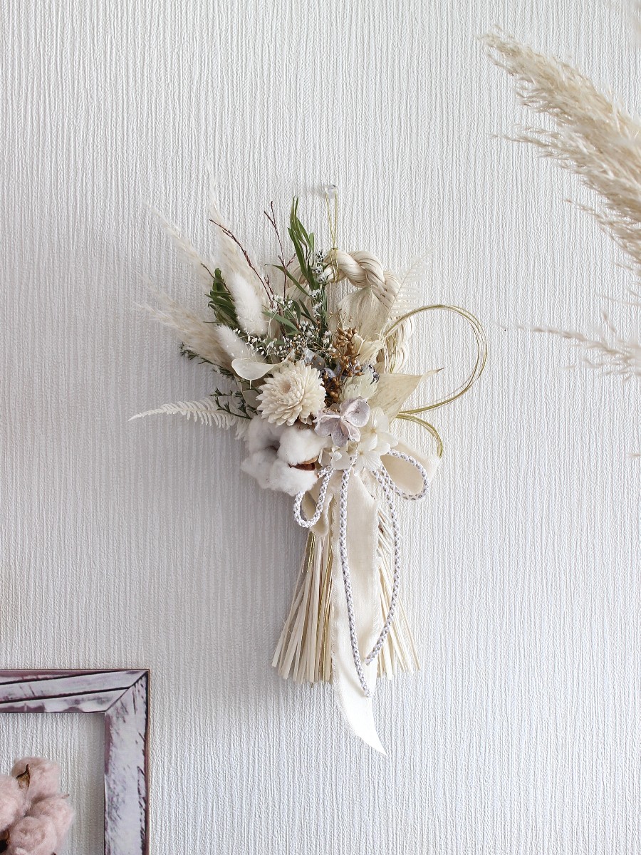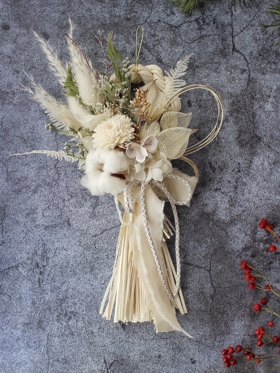 白を基調に、清らかな空気をまとったしめ飾りを作りました。