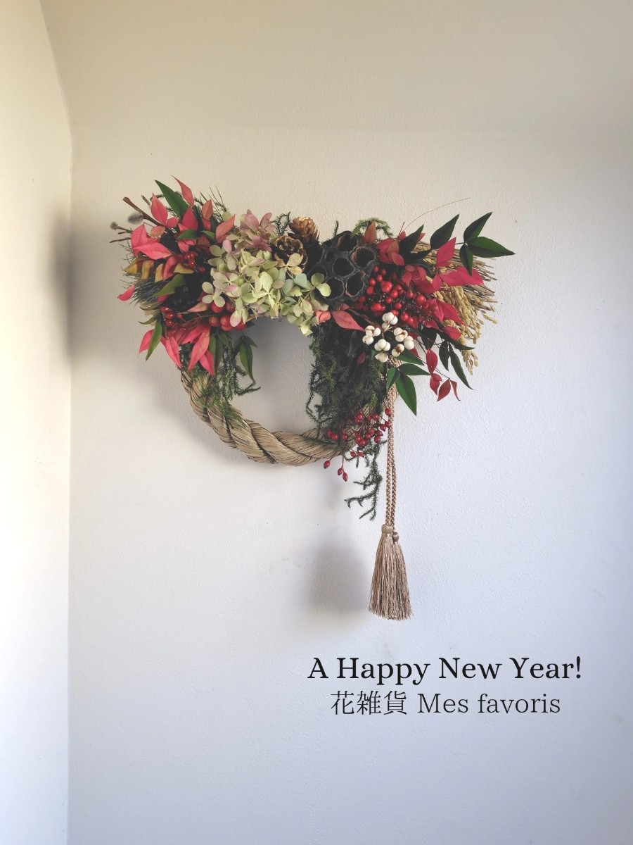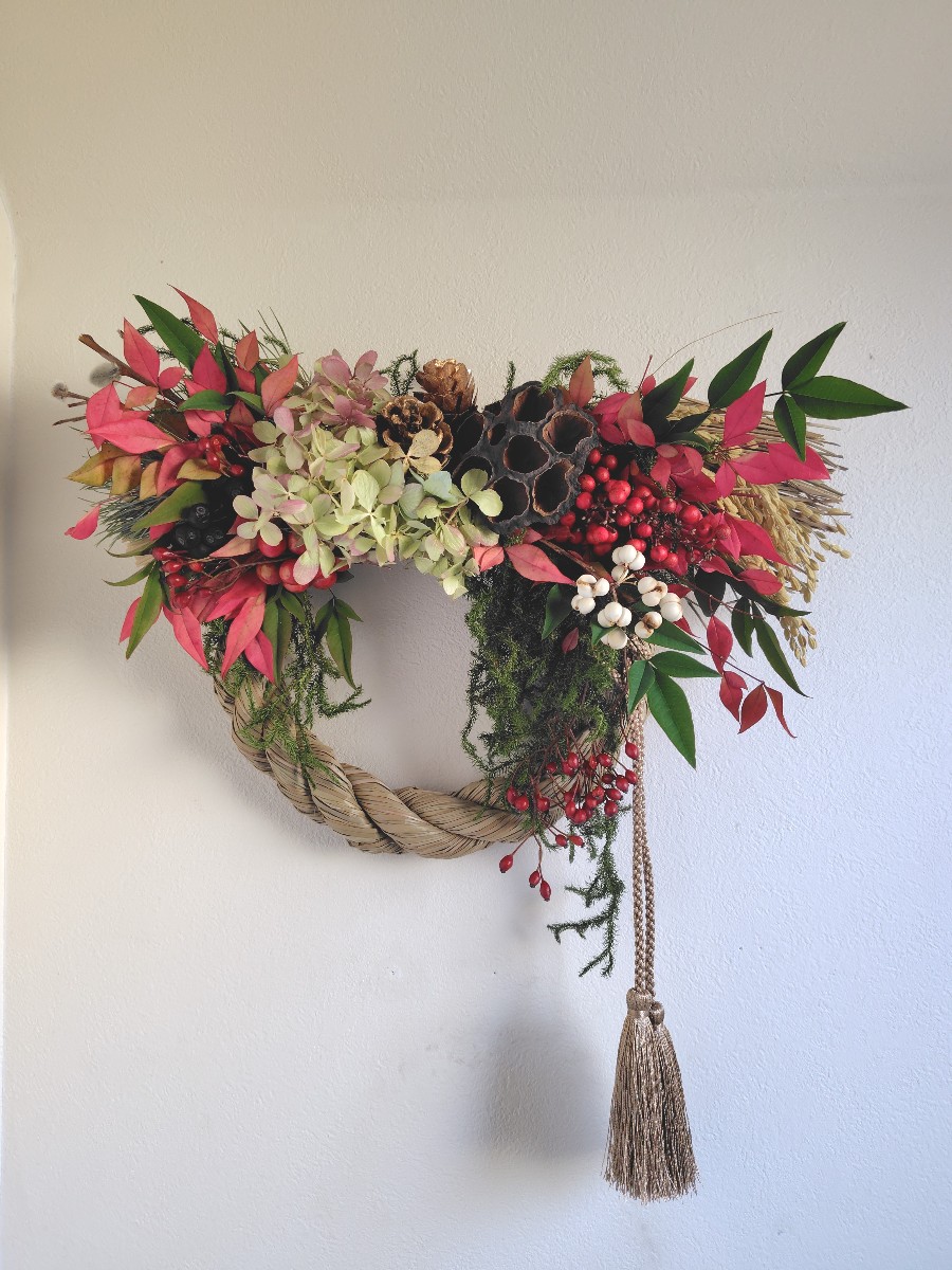 松、南天、紫陽花など、縁起の良い植物で作ったしめ飾りです。