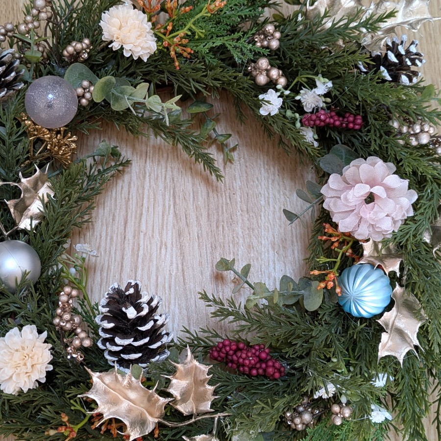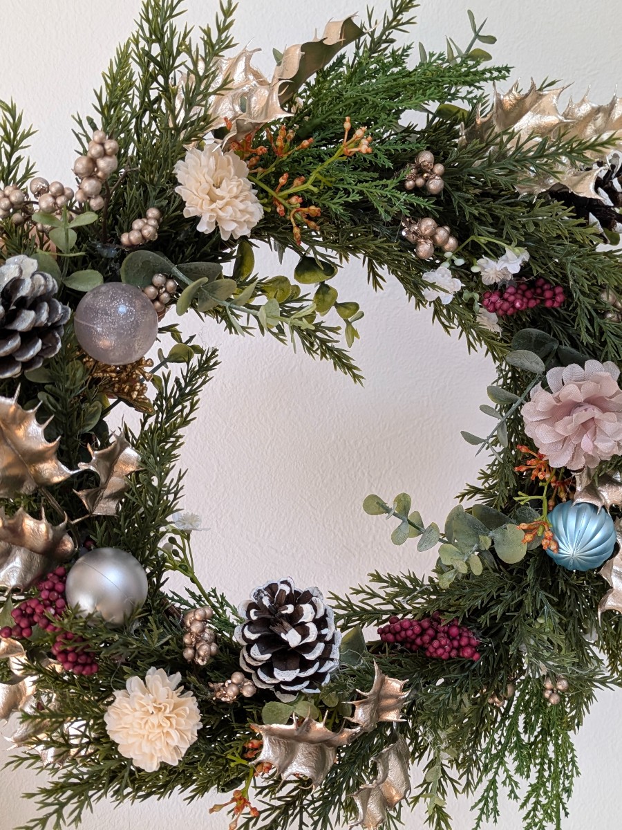 深いグリーンに木の実やくすみカラーの小花を合わせた、