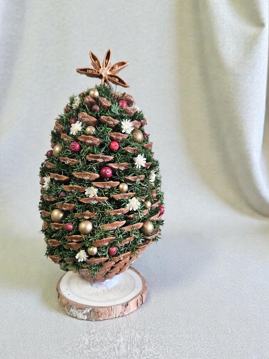 大きなマツボックリをツリーに見立てたテーブルツリーです。