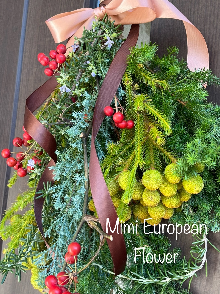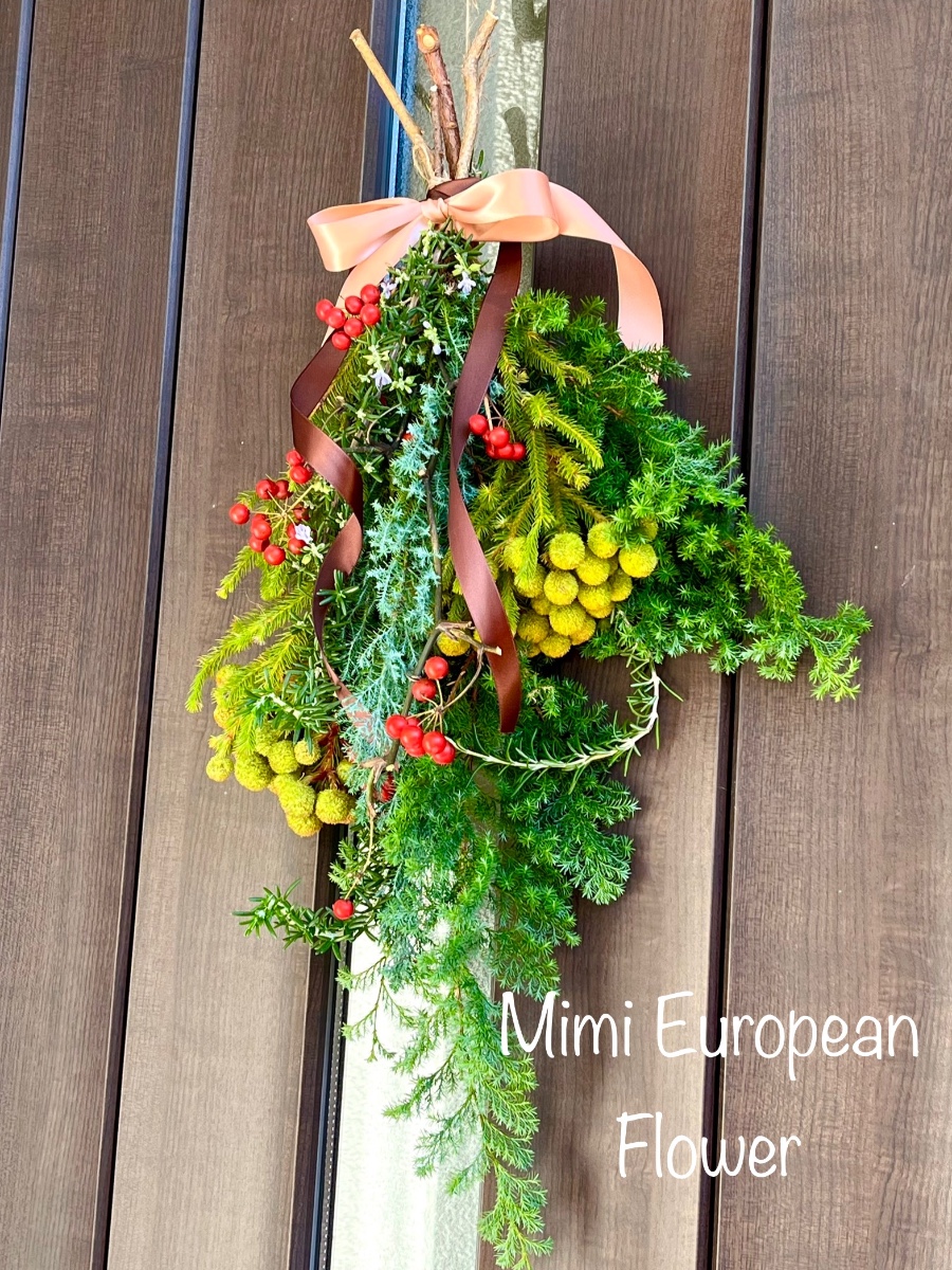 グリーンの上にバーゼリアやサンキライの実で立体感を演出。スワッグはバインディングポイントが一箇所の手軽なアレンジ、簡単に作れて長く楽しめます!