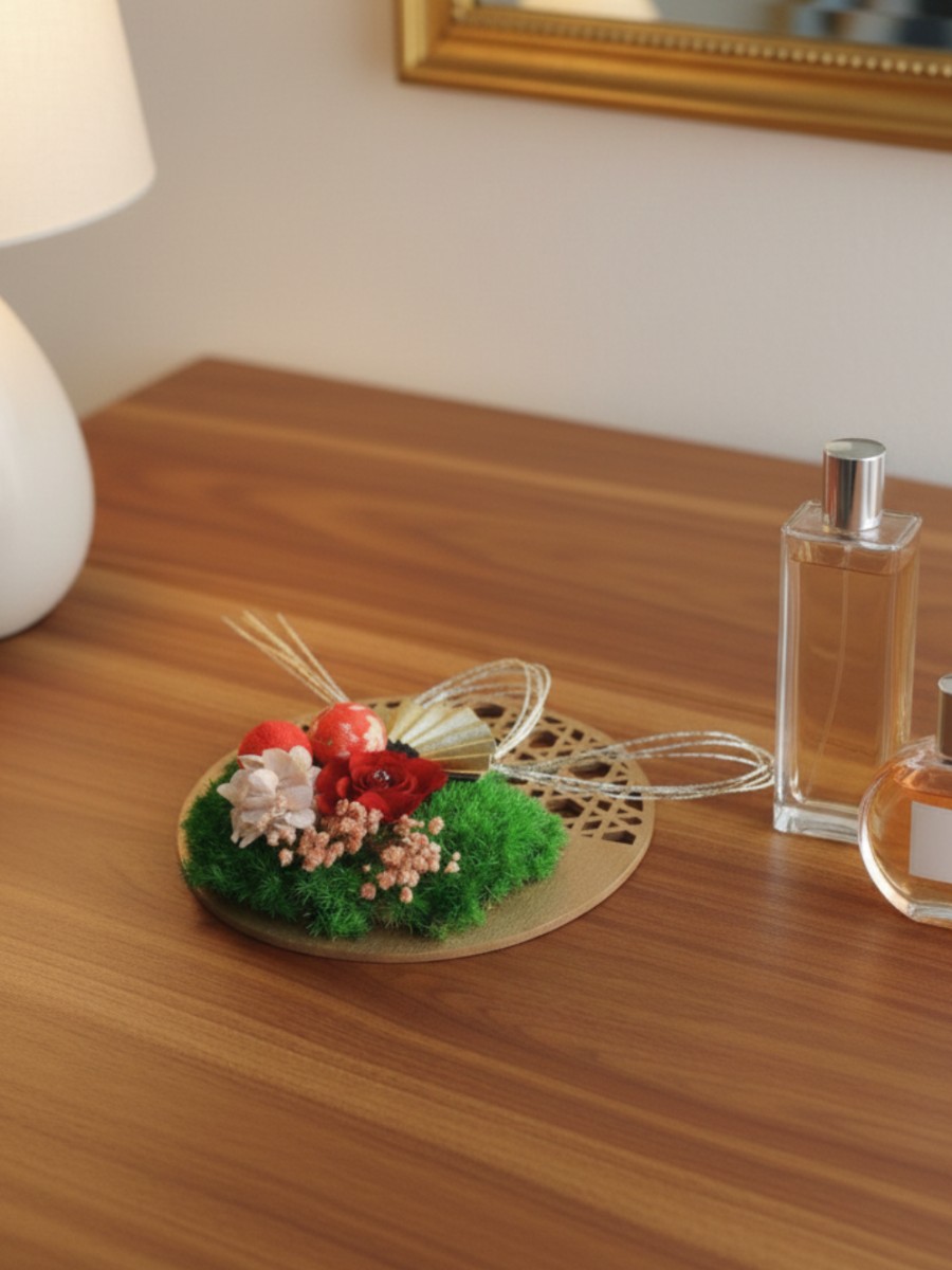 ベースには、厄除けの意味を持つ籠目模様の木製プレートを使用。