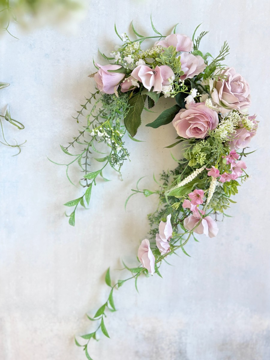 ラベンダーピンクのローズやスイートピーなどで優雅なリースに。