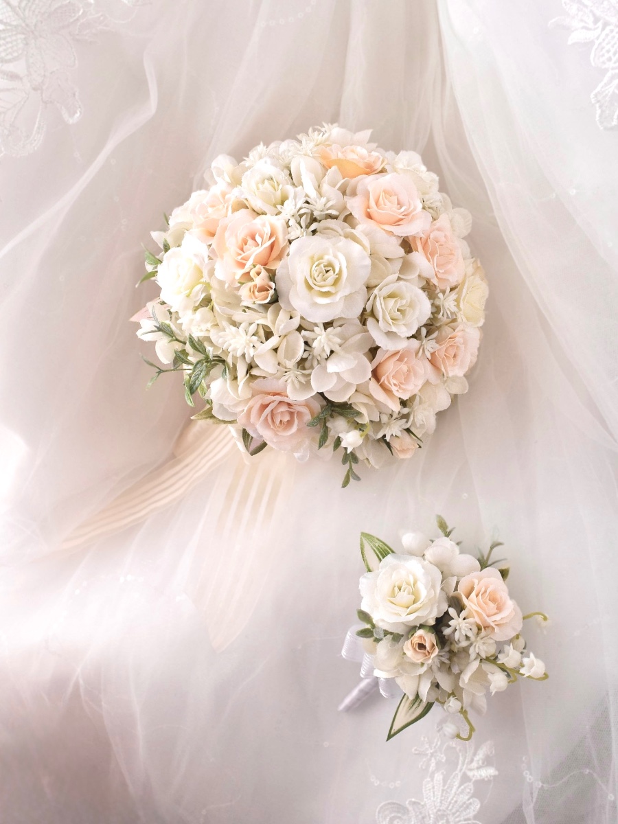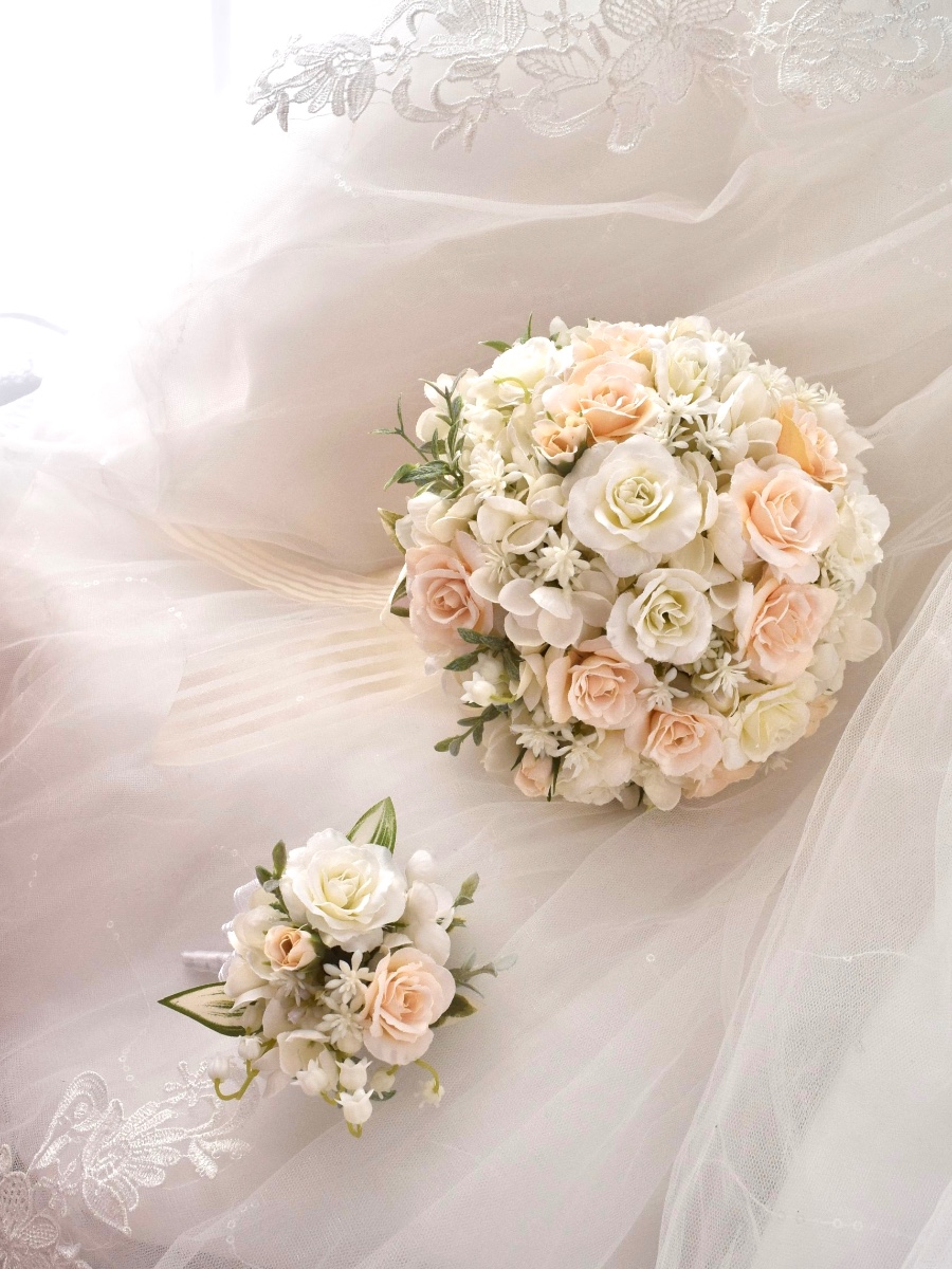 バニラ色のバラとホワイトのバラやアジサイを組み合わせています。