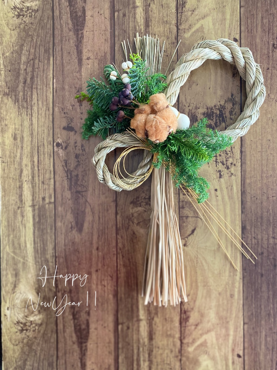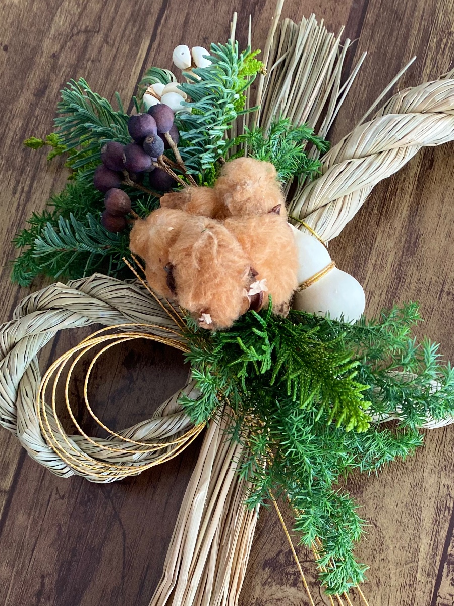 ブラウンのコットンにモミやヒムロスギなど針葉樹を添えたあたたかみのあるしめ縄飾りです