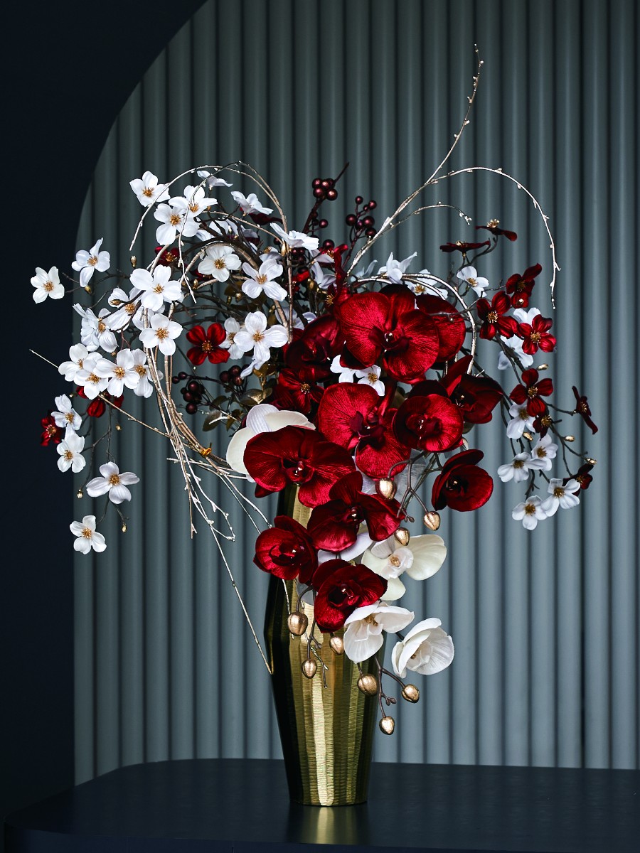 ベルベットタッチの紅白のドッグウッドとコチョウランにゴールドのウィローやリーフを組み合わせて、動きのあるオブジェ風アレンジにしました。器もゴールドにして統一感をだし、白いペット素材のドッグウッドも混ぜて花材の質感の違いも楽しめるアレンジです。