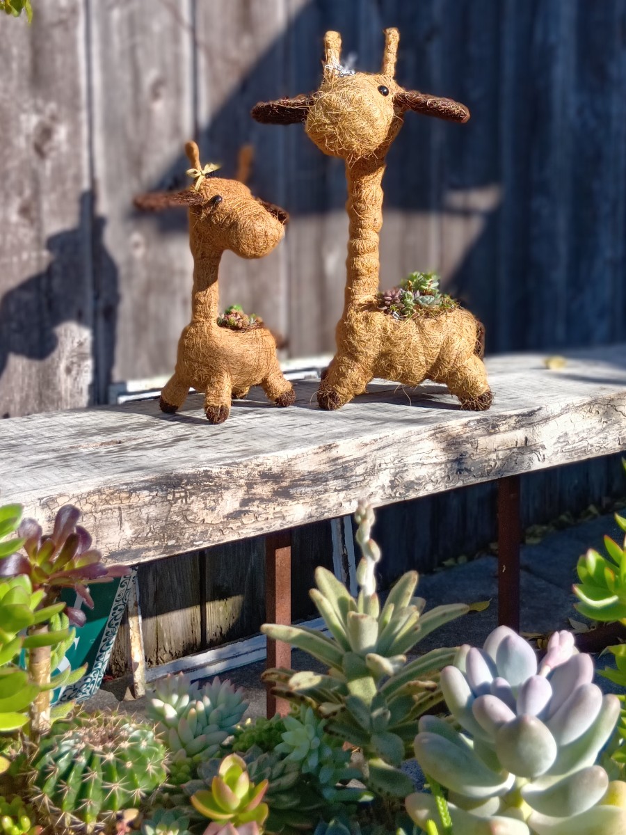 多肉の向こうでキリンの親子がこっちを見てます。