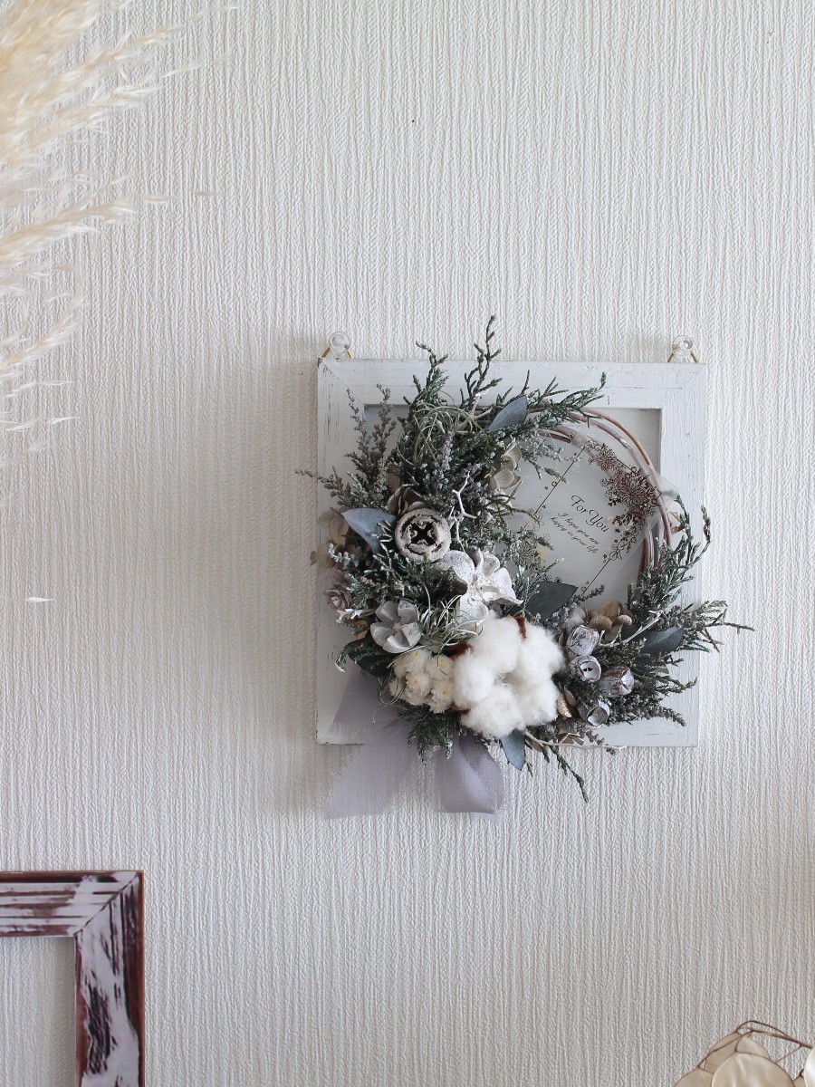 白いウッドフレームに、手のひらサイズの小さなリースを、そっとあしらったクリスマスフレーム。