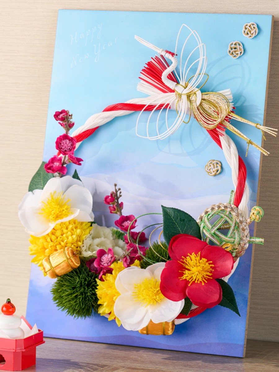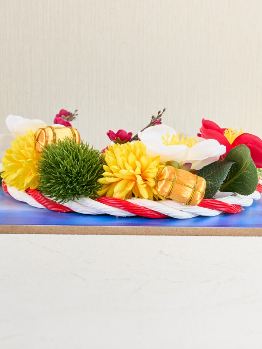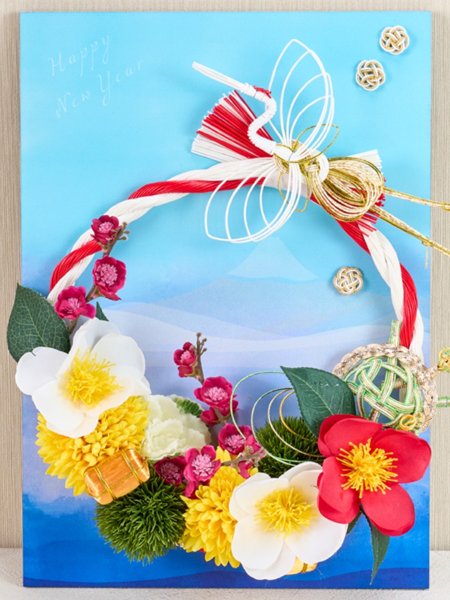 富士山・鶴・金俵と日本らしい豊かで縁起の良い正月飾りです。