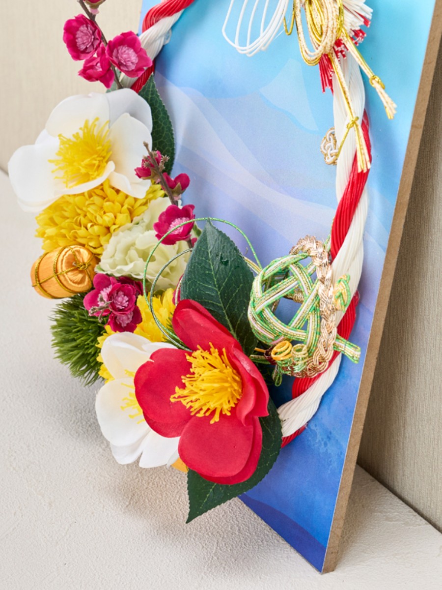 水引しめ縄を円にしてベースにグルーで接着しています。