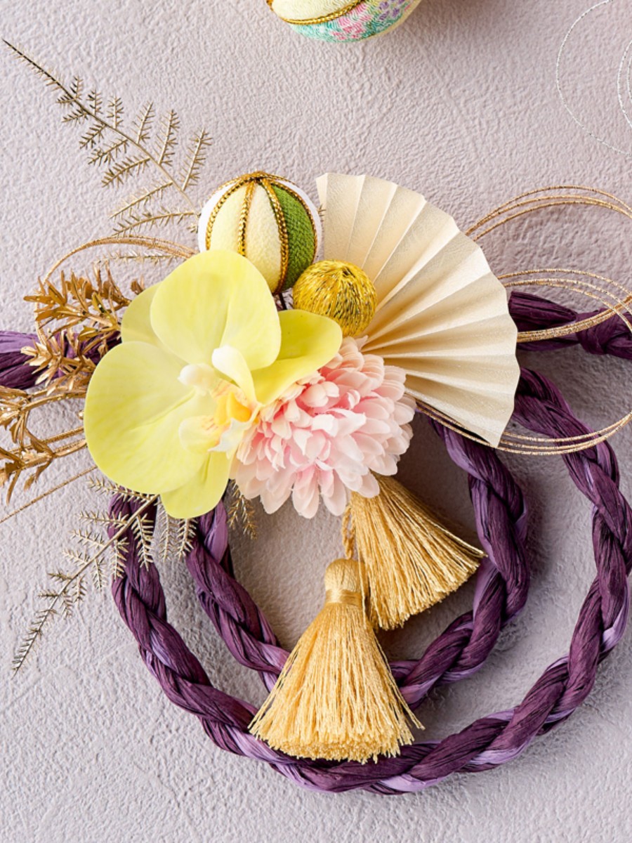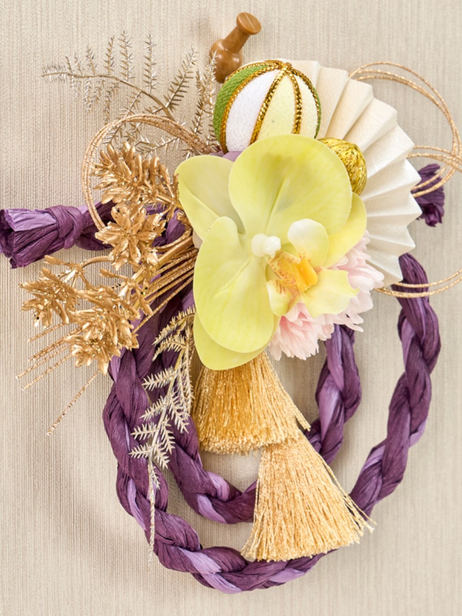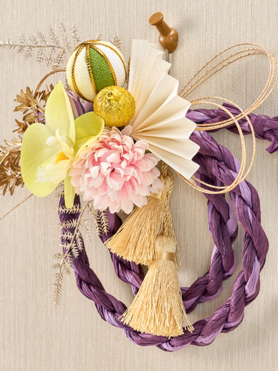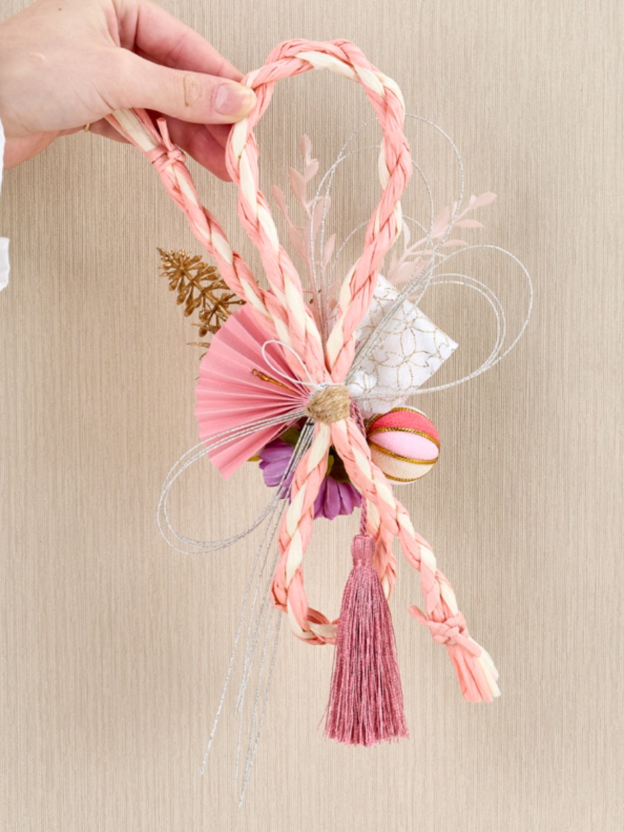 ペーパー〆縄、水引は形を整えた後ワイヤーでねじり留めて固定しています。