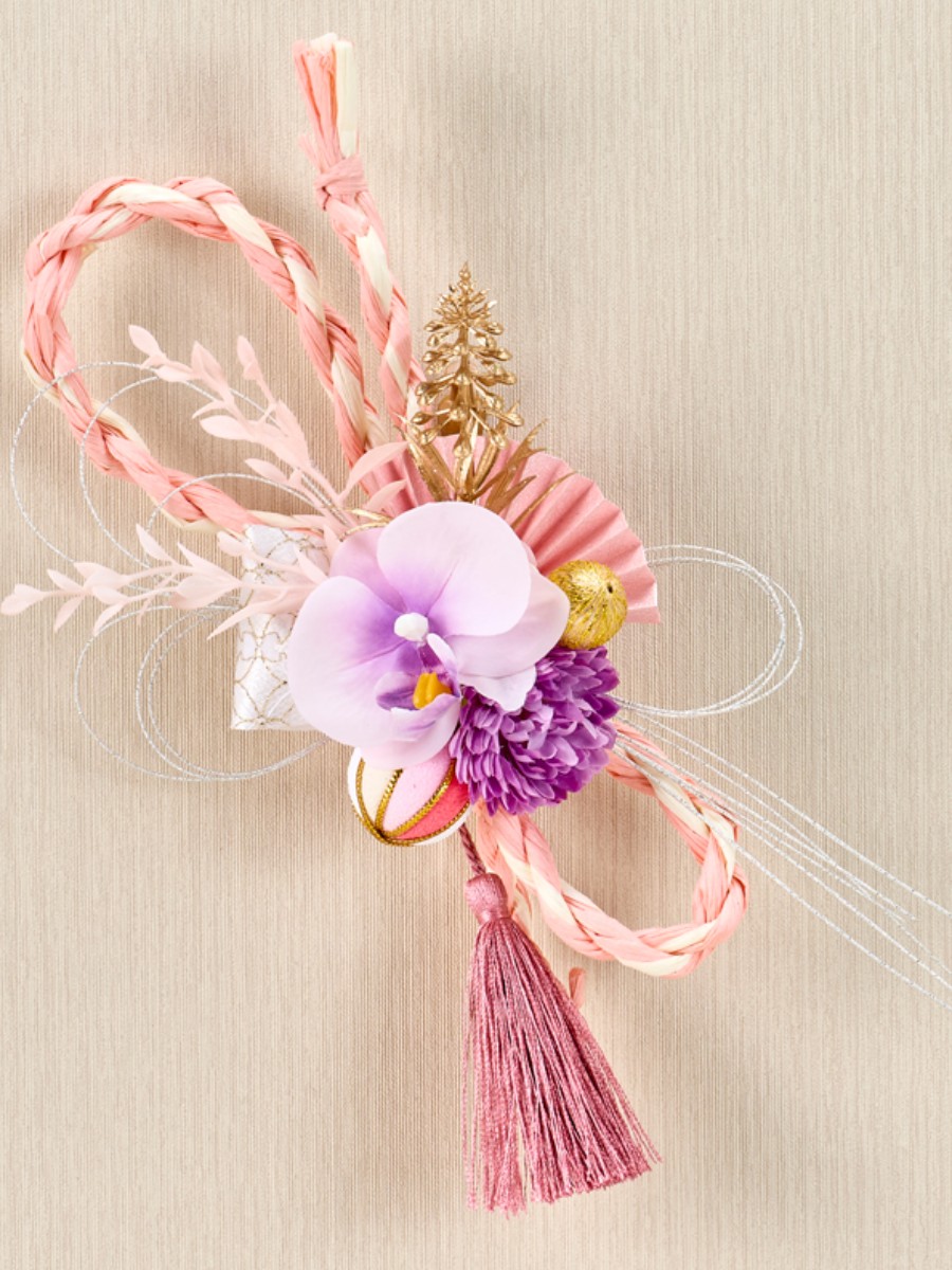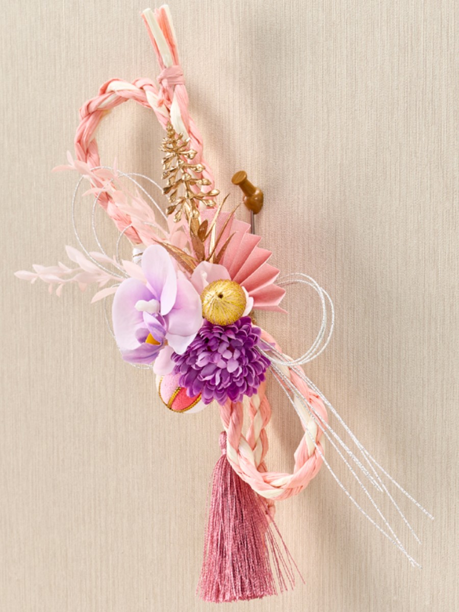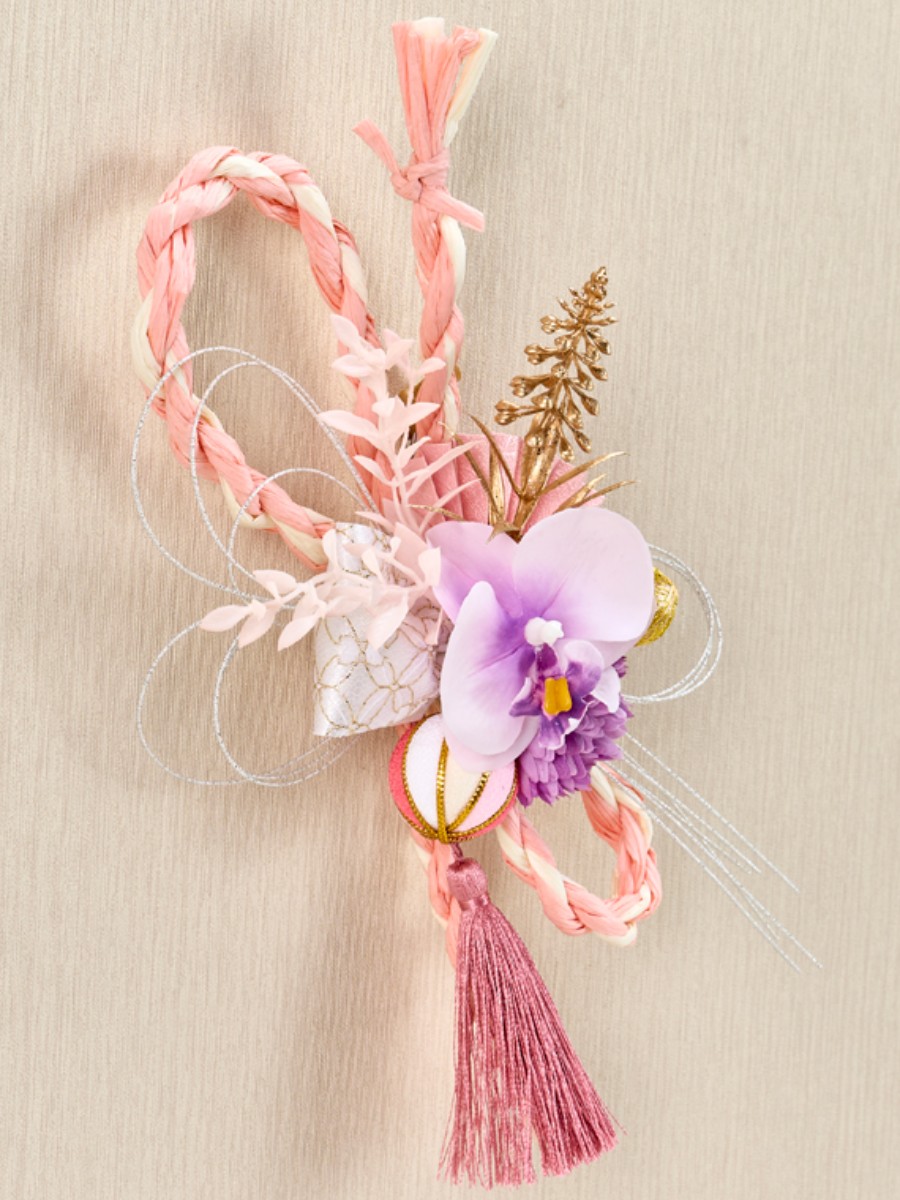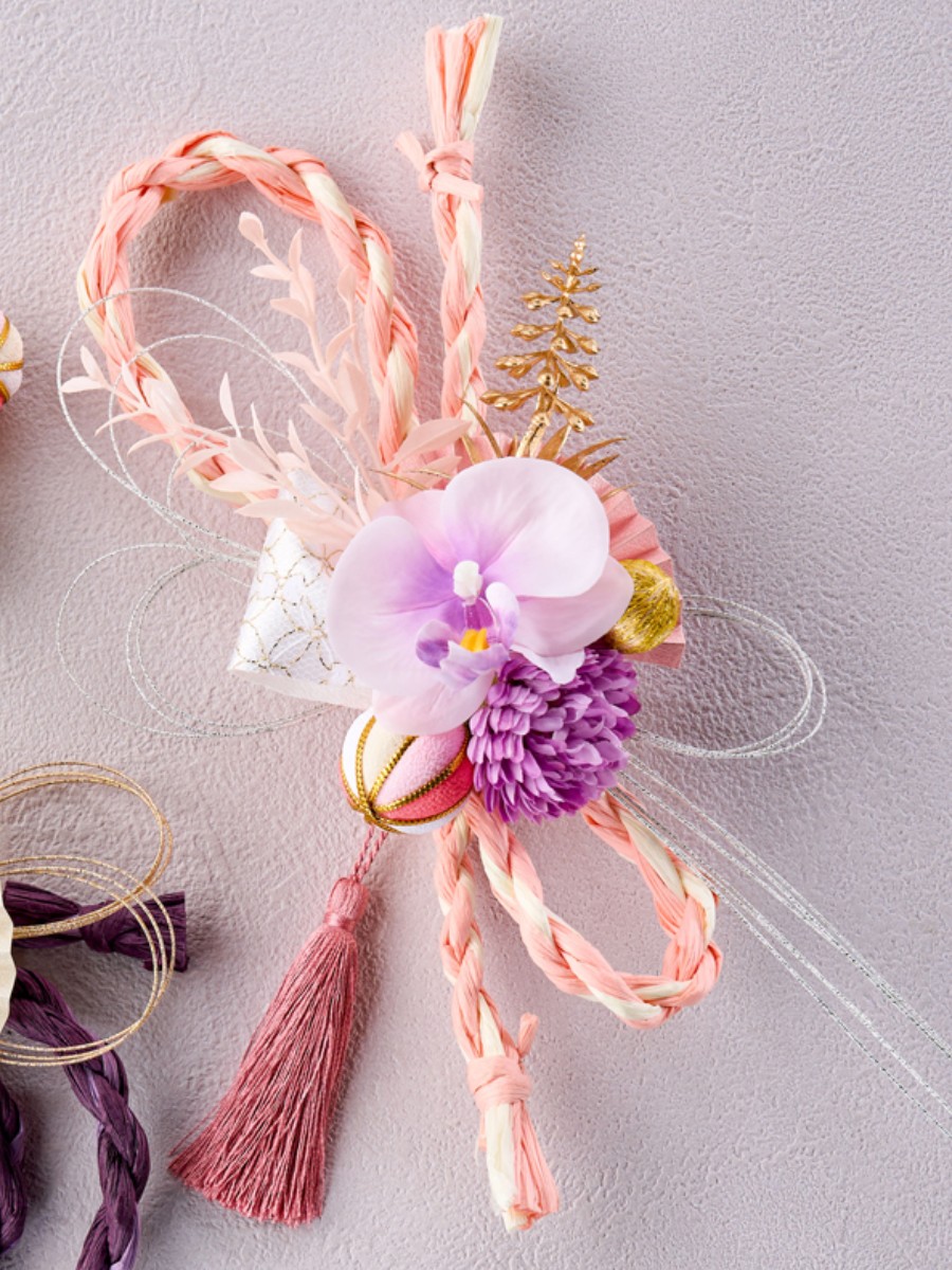 ペーパー〆縄、水引は形を整えた後ワイヤーでねじり留めて固定しています。