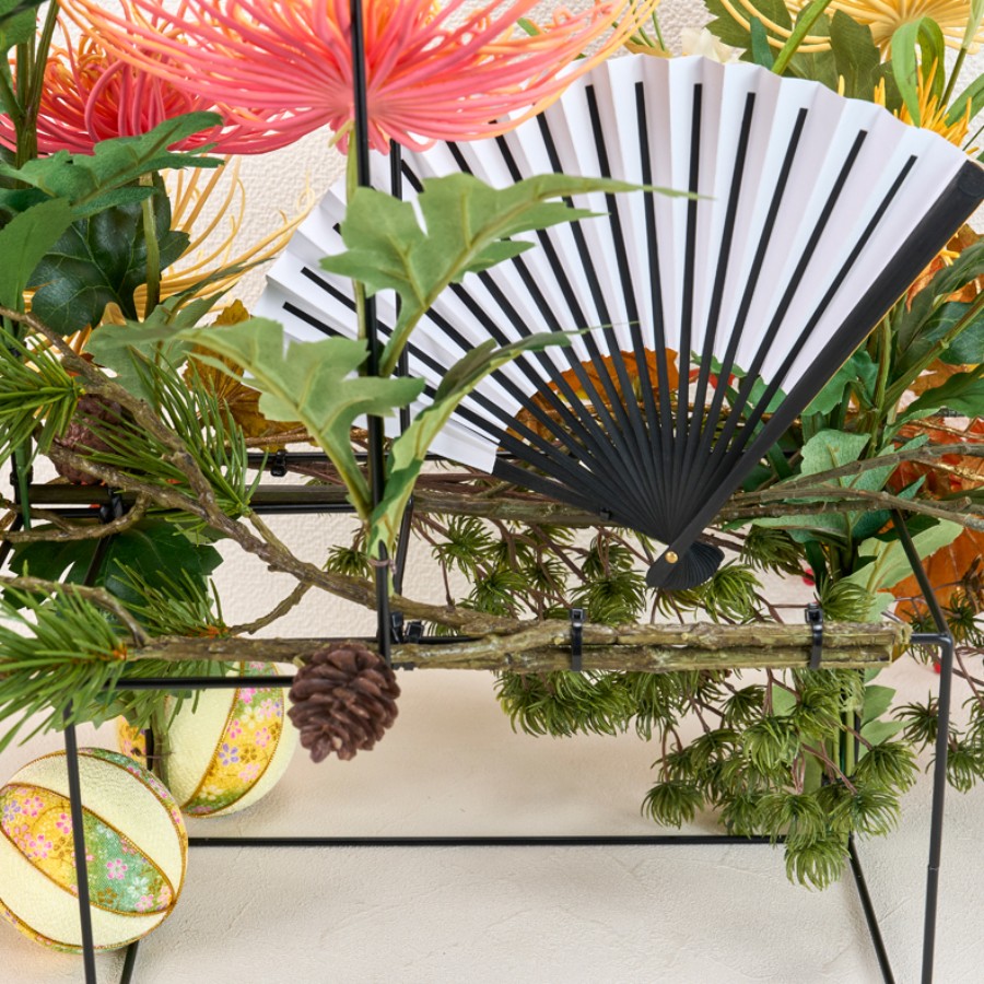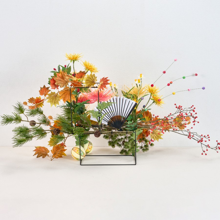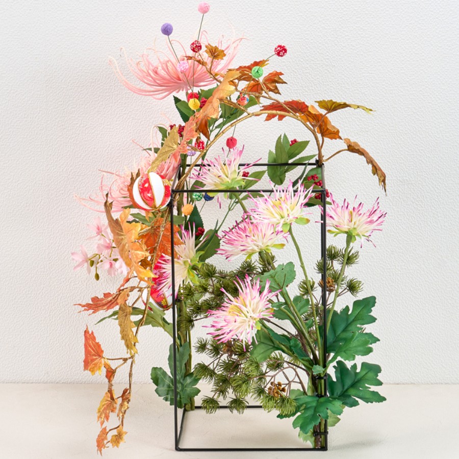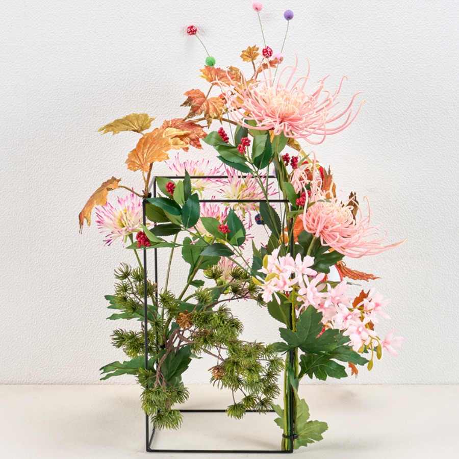 ワイヤーレクタングルベースに花材をケーブルタイで留めながら、全体的に伸びやかにアレンジしていきます。