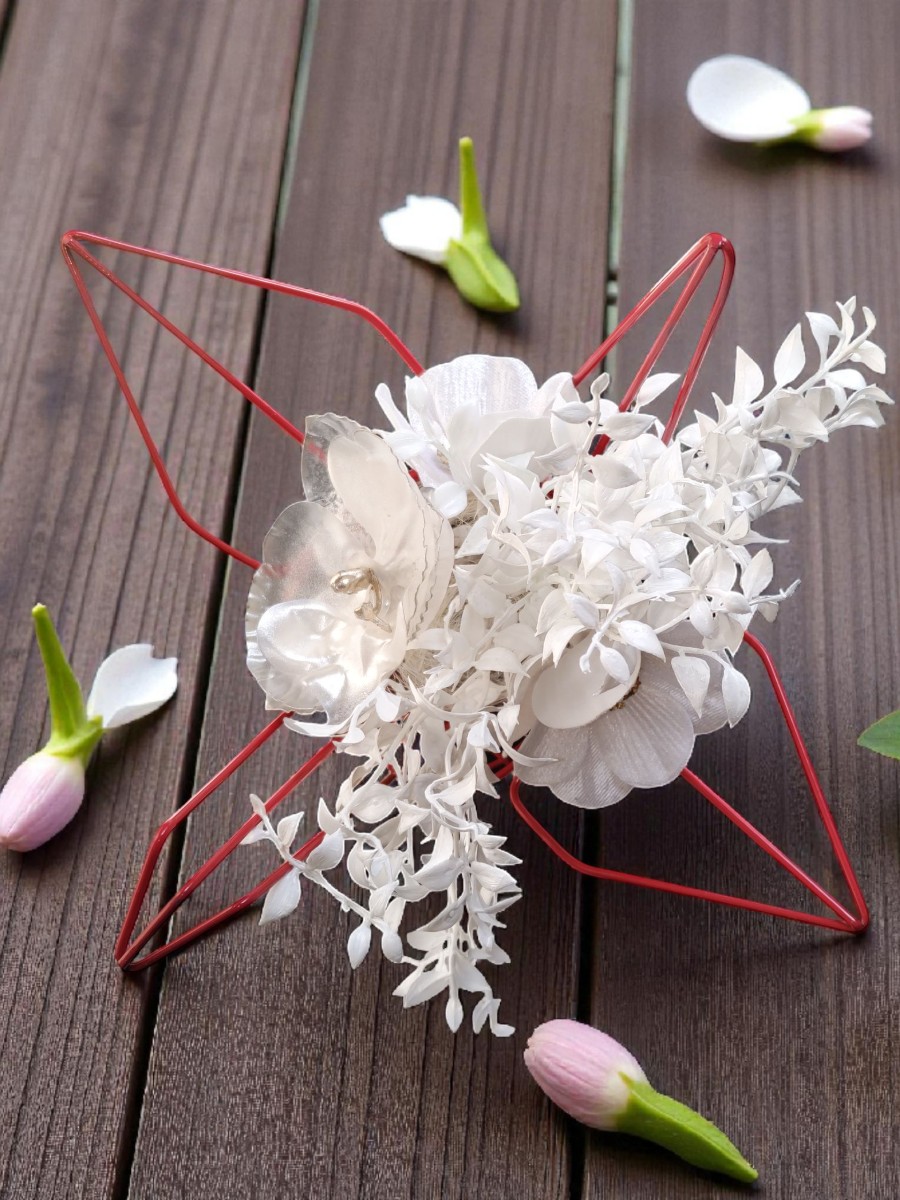 赤い鶴のワイヤー花器に、アーティフィシャルフラワーのホワイトのお花をアレンジメントしました。