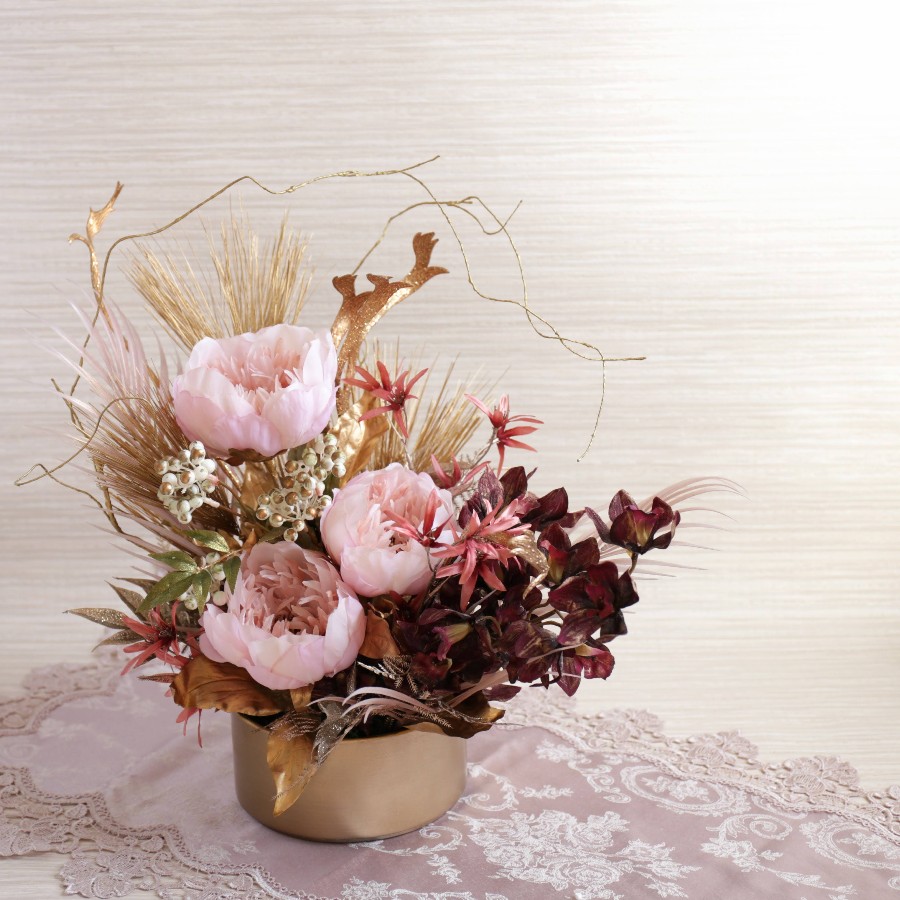 ふっくらとした淡いピンクのピオニーをメインに、シャンパン~ゴールドの松、枝もの、実ものを織りまぜた華やかな迎春用和モダンアレンジメントです。